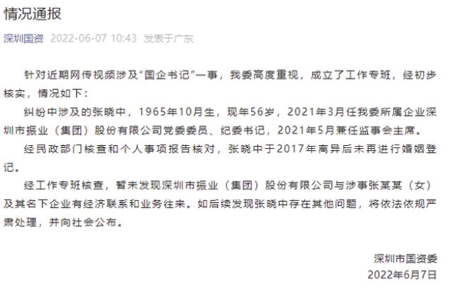 | 深圳市国资委在其微信公众号上通报,针对近期网传视频涉及“国企书记”一事,深圳市国资委委高度重视,成立了工作专班,经初步核实,情况如下: 纠纷中涉及的张晓中,1965年10月生,现年56岁,2021年3月任深圳市国资委所属企业深圳市振业(集团)股份有限公司党委委员、纪委书记,2021年5月兼任监事会主席。 经民政部门核查和个人事项报告核对,张晓中于2017年离异后未再进行婚姻登记。 经工作专班核查,暂未发现深圳市振业(集团)股份有限公司与涉事张某某(女)及其名下企业有经济联系和业务往来。如后续发现张晓中存在其他问题,将依法依规严肃处理,并向社会公布。 |