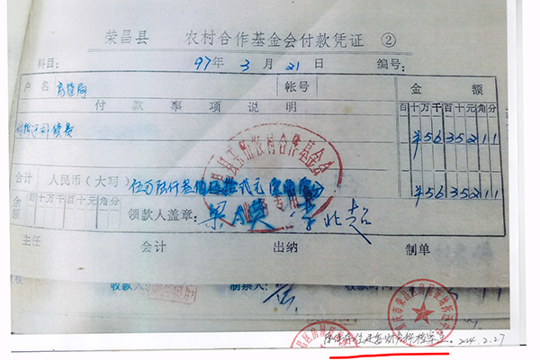 “我只领了一笔钱,1997年3月21日56352.11元荣昌县农村合作基金会那张凭证;3.2万多元凭证,我不认可。”