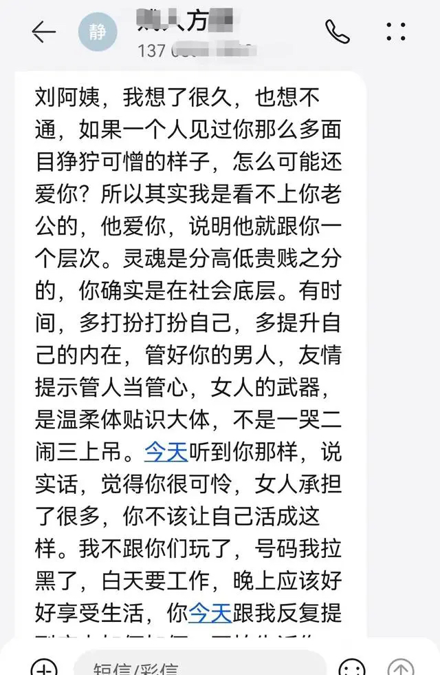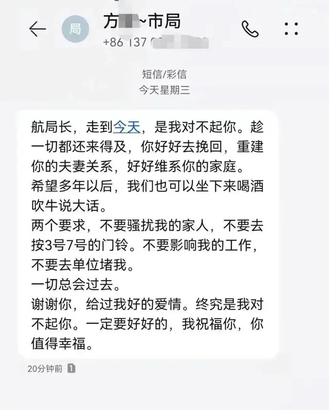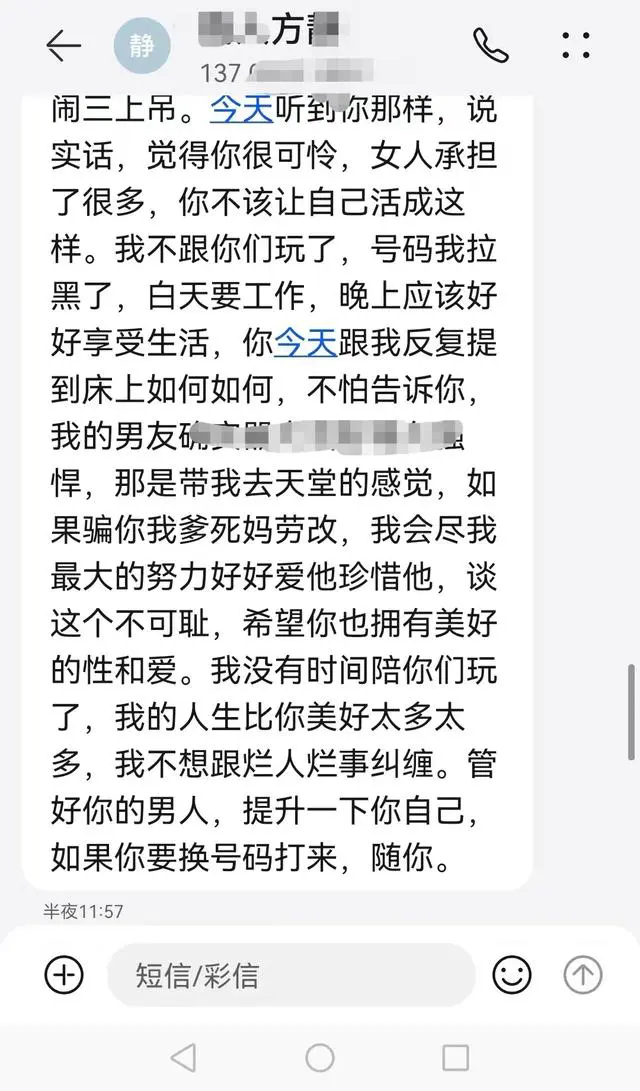 昆明一局长被举报婚内出轨,小三叫板原配 当地纪检监察:已介入调查 来源:奔流新闻 4月7日上午,昆明市生态环境局阳宗海风景名胜区分局局长史某被举报婚内出轨,和一女子长期同居,女子还发信息羞辱史某妻子:“你确实是在社会底层”“觉得你很可怜”“我的人生比你美好太多太多”。当日,昆明市纪检委驻市生态环境局纪检监察组表示已经对举报信息介入调查。 女子发信息羞辱史某妻子 举报信息显示,昆明市生态环境局阳宗海风景名胜区分局局长史某婚姻期间在昆明市呈贡区一小区公开与他人同居,并公布了当事人出入小区的监控视频。 举报者还公布了疑出轨女子方某发给史某妻子的短信:“灵魂是分高低贵贱之分的,你确实是在社会底层”“说实话,觉得你很可怜”“我的人生比你美好太多太多,我不想跟烂人烂事纠缠。管好你的男人,提升一下你自己……”同时还有方某发给史某的短信:“局长,走到今天,是我对不起你。趁一切都还来得及,你好好去挽回,重建你的夫妻关系,好好维系你的家庭。希望多年以后,我们也可以坐下来喝酒吹牛说大话。两个要求,不要骚扰我的家人,不要去按3号7号的门铃。不要影响我的工作,不要去单位堵我。一切总会过去。谢谢你,给过我好的爱情。终究是我对不起你。一定要好好的,我祝福你,你值得幸福。” 女子发给史某的短信 当日奔流新闻记者联系到昆明市生态环境局,工作人员称史某确实是阳宗海风景名胜区分局局长,但不知道被举报出轨一事。工作人员随后提供了阳宗海风景名胜区分局办公室电话,记者拨打显示欠费停机。 昆明市纪检委驻市生态环境局纪检监察组工作人员告诉奔流新闻记者,已经注意到网上举报信息,目前正在调查之中。 |