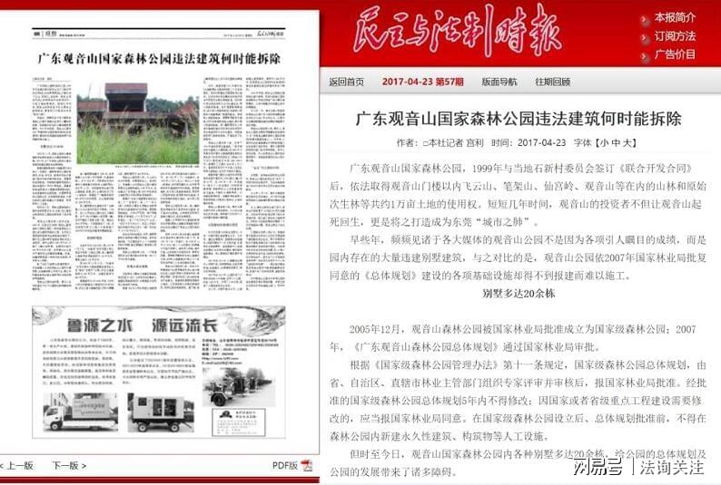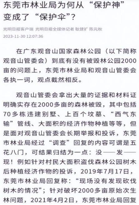 奇!制约打压国家森林公园,林业局五任局长各显花招 广东观音山国家森林公园位于东莞市樟木头镇,25年前是一个村里的无名荒山,在东莞知名企业家黄淦波的精心投入下如今坐拥东莞市最大最完整的原始次生林,森林覆盖率达92%,成为广东的森林旅游和文化名山,是全国首家民营国家级森林公园、国家4A级旅游风景区,在国际上都有极高的声誉。 几任局长诸如罗松茂、吴淑萍、安连天、黄德洪也都是无视观音山森林公园,甚至局领导多次对人说:我们这没有观音山国家森林公园! 2018年11月30日,中国商报第11版刊发了《谁在阻碍广东观音山国家森林公园升级发展》,文末曝光了记者采访情况:今年3月23日,东莞市林业局对外公布了“东莞市森林公园名单”。该名单显示,“观音山森林公园”所属镇街(林场)为“樟木头镇(属银瓶山森林公园范围)”。对此,东莞市林业局于今年9月20日对中国商报·旅游导报记者解释说,该名单中的“观音山森林公园”指代“东莞市观音山森林公园”。东莞市观音山森林公园是2000年12月经东莞市政府批准设立的市级森林公园,位于樟木头镇,总面积为17.45平方公里。然而,今年10月31日,东莞市林业局对记者说,鉴于广东观音山国家森林公园(国家级)成立并分离后,东莞市观音山森林公园(市级)的剩余重叠区域已纳入银瓶山森林公园进行统一管理,所以今年取消了“东莞市观音山森林公园(市级)”的名称。事实上,东莞市林业局的说法值得商榷。今年9月20日,该局书面答复中国商报·旅游导报记者时称,观音山国家级森林公园“一直没有开展确界工作,至今未有准确具体的范围界线”。既然没有确界,广东观音山国家森林公园是如何“分离”出去的,东莞市观音山森林公园(市级)的“剩余重叠区域”又是如何确定的?东莞市林业局并未就此做进一步解释。 此时东莞市林业局局长是吴淑萍,在第二年12月被免职,她是东莞市林业局任期最短的局长,只有2年多。 首次修编被阻挠 2007年7月广东省林业局原则同意《广东观音山国家森林公园总体规划》,但是樟木头镇和东莞市林业局唱双簧,为抢夺观音山公园的经营权和财产,想尽快“解决”观音山公园问题。 2007年8月14日,樟木头镇政府向东莞市林业局提交《关于观音山森林公园〈总体规划〉有关问题的报告》,提出:我镇拒不承认观音山公司所作的观音山森林公园《总体规划》,建议市林业局向省林业局反映实情,不同意黄淦波所规划的观音山森林公园总体规划。 此时的林业局长是罗松茂,他在其中充当了什么角色?看看下面的事可以窥之一二! 古树研究专家李平日教授被警告 2002年,观音山董事长黄淦波先生在《羊城晚报》上看到一篇文章,报纸上说古树不仅是反映当时当地生态环境的一部史书,同时还能为预测未来气候以及环境变化提供科学依据。报道详细介绍了广州地理研究所李平日教授带领团队依据几十棵古树的物理、化学指标,编制了一份广东5000年来气候地理变化的研究报告并获得全国大奖,佐证了国家气象局长竺可桢当年对中国五千年来气候变迁的科学论断。目前研究已结束,这些古树标本需找地方安置。黄淦波立即打电话给《羊城晚报》要到了李教授的电话,第二天二人见面后约定黄淦波在观音山划出兴建场馆的地方,用以保护古树、并合作建立古树保护科教基地。两人分头行动,黄淦波负责建设场馆,李平日教授负责带人再去收集更多的古树。李平日教授带领着工作人员在珠三角甚至更远的地区收集古树。2004的9月10日,观音山古树博物馆落成,并免费对外开放。 2004年12月古树博物馆被东莞市科学技术协会、东莞市科技局、东莞市教育局表彰为东莞市首批“科普教育基地”称号。2005年,该馆又被广东省科学技术厅、中共广东省委宣传部、广东省教育厅、广东省旅游局、广东省科学技术协会联合命名为“广东省青少年科技教育基地”。 2008年、2009年、2010年东莞市林业局局长罗松茂分别带了一伙人及安排专人找到广州地理研究所的李平日教授,警告他不能够再跟观音山合作。李教授很纳闷,什么原因导致东莞市林业局兴师动众来要挟呢?李教授坚持认为自己和观音山搞古树研究和保护是好事,没有退缩。 多人在观音山毁林建别墅修坟墓等违法建设 林业局视而不见 2009年初,石新社区负责人蔡某生未经公园同意和国家林业局批准,强行在公园内保安部宿舍旁砍伐近6亩森林,推平山坡约3800平方米,兴建了二幢大型别墅。 此外,港籍人士余某等也其支持下在观音山公园内占地二千多平方米兴建豪华别墅,这些建筑要么手续不全,要么实际建筑面积远远超过土地使用权证所标明的用地面积。 坐落在观音山森林公园内的违规违法别墅有22栋,在多次向东莞市林业局等部门反映无果后,多家地方和国家级媒体纷纷曝光此事。 2017年,《民主与法制时报》报道的《广东观音山国家森林公园违法建筑何时能拆除》 国家森林公园内修建别墅事件以《4A级观音山国家森林公园竟藏22栋私人违建别墅》为题在央视曝光,多家媒体也纷纷报道,引起强烈反响。但时任局长吴淑萍依旧无动于衷,任其发展。 大煞风景的广东观音山国家森林公园景区内"豪华公墓"(来源于环球网) 截至2022年底,陆续有不法分子在观音山私建大小坟墓20多座,多数占地面积为50平方米至100平方米,其中有两座坟墓占地面积超过300平方米