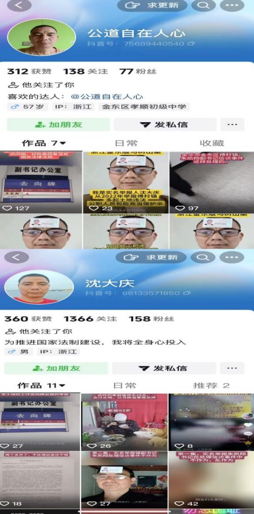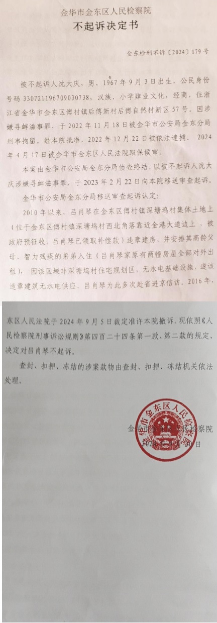 发布在镇政府门口下跪视频 村民被抓捕 经三次庭审 检察院撤案 独立撰稿人 李海波 近日,浙江金华市金东区傅村镇村民沈大庆等人来到北京,向知名刑辩律师贾霆表示感谢,他说,他被当地司法机关关押了17个月,眼看就要被定罪判刑,贾霆律师介入后力挽狂澜,最终检察院不但撤诉了,还在上个月作出了不起诉决定! 然而,贾霆律师却表示,自己并不是沈大庆的辩护人,而是其同案被告人吕肖琴的辩护律师。这个案子最终能做到无罪,首先是因为案件本身存在问题,当事人的行为不构成犯罪;其次是因为当事人自己的坚持;依法为无辜的公民辩护,乃是律师的天职。 这起案件源于镇政府施工挖断村民水管28天未修复,残疾村民多次向政府反映无效后,带着九旬父母到镇政府门口下跪,最终被抓捕。 金东区傅村镇是诗人艾青故里,民风淳朴。但自章淑剑担镇书记以来,为了自己的政绩,在没有审批的情况下,以土地流转的方式破坏四百余亩基本农田和林地,村干部违纪违法成风,为此引起群众不断举报…… 沈大庆的抖音号,原来的号被封杀 老举报人与弱势户 在求助镇政府中相遇 出生于1967年的沈大庆是举报人之一,原来经营一家装修公司。他因多次举报村干部多种违法违规行为,镇政府都没有给予答复,为此他在抖音上多次发视频举报。 1961年出生的吕肖琴是深塘坞村人,32岁时一场车祸使她致残,她决定不再嫁人,留在村里身边照顾年迈的父母。1998年,她妹妹吕月琴已出嫁,两个弟弟一个因病死亡、一个智力残疾,家人纷纷指责吕肖琴是扫帚星,而患精神病的弟弟经常暴力殴打她,无处栖身的她只得借宿亲戚朋友家,有时还在寺院里住上一段时间。为此她不得不把自己的户口独立分出,然后陆续十几次向村、镇有关部门申请批地建房,但均因村里有宅基地“批男不批女”的规定而无法通过。经吕肖琴上访后,金东区两任区委书记分别作出批示,要求傅村镇帮助解决吕肖琴住房困难问题。 深塘坞村村委会曾在2011年6月1日吕肖琴写的批地建房申请报告上盖有印章。 2014年4月,《浙江日报》“佳友民情快车”栏目刊发了《54岁不婚农村女申请宅基地遭拒 吕肖琴:我想有个家》、《未婚女批地建房有转机》连续报道了吕肖琴申请宅基地16年,一直没有通过审批的遭遇。 该村村委会在2019年6月6日吕肖琴填写的《金东区农村村民(居民)建房申请审批表》“村委会意见”一栏盖印,还有该村现任村党支部书记傅得志的签名。但不知何故,傅村镇政府一直没有给她办理用地审批手续。 2011年春节临近,吕肖琴在自家菜地上建了一栋90平方米的简易房作为栖身之所,简陋到没有水、电。直到2016年下半年,在她和母亲多次申请(跪求)下,镇政府为其接通了水电设施。2017年9月,吕肖琴父母的老宅被傅村镇政府强行拆除。为此,她父母提起行政诉讼,虽然镇政府被兰溪市人民法院行政判决书确认为“违法强拆”,但拆掉的房屋却无法恢复原状,无处居住的两位年迈老人只得居住在吕肖琴家里。 2022年10月上旬,通往她家的自来水管被镇政府某工程项目施工挖断,停水近1个月未修复。一家4口只得拖着老弱病残之躯,每天到数百米外的村里去提水解决生活之需,步行来回要20多分钟,就连村长也帮忙提了4、5次水。为此,吕肖琴与母亲多次向镇政府、区信访局反映, 但村、镇两级政府均以该处住宅系违章建筑为由不给修复水管。镇政府曾提出,维修水管的1万元费用要她家负担一半,但吕肖琴认为,上届政府为她家接上了自来水,本届政府施工挖断了,理应为其修复供水,维修费用不该由她家承担。 10月的一天,沈大庆在镇政府的一次举报中认识了吕肖琴,由此他了解到吕肖琴家是老弱病残户,生活用水已被停了二十余天,吕肖琴每天像在镇政府上班一样,在镇委章淑剑、朱凯祥书记办公室门口要求解决生活用水问题未果。 拍视频发抖音后问题解决 几个当事人却被刑拘 几天后,沈大庆路过吕肖琴家,发现镇里仍未给其家恢复供水。古道热肠的沈大庆认为就算是违章建筑,政府也有义务维护老百姓的基本生存权。 熟悉装修工程的沈大庆认为距离吕肖琴家直线距离数十米外的公园公厕就有自来水源,架接到她家成本估算只需1000余元,而傅村镇政府舍近就远架接费用高达1万元,这不合常理。在与吕肖琴姐妹聊天中,沈大庆听说吕家几年前的自来水管是吕肖琴的母亲找到镇政府领导下跪后才给安装的,于是将吕肖琴母亲提水的场景拍成了视频,并建议吕肖琴的母亲再次到镇政府跪求领导。 11月3日是吕肖琴家自来水断供的29天。上午八点多,吕肖琴搀着年迈的父母,在宽达7米有余的傅村镇政府大门外的通道中间跪下,并举着一个写有“请章某某书记给点水喝”的木牌,引起了部分群众的围观。此举再次被人拍成视频,连同之前她母亲提水视频,经沈大庆编辑后一起发到抖音上。 11月4日,傅村镇政府立即派人维修水管,恢复正常供水一直拖延到11月19日,吕肖琴家自来水断供长达40余天! 吕月琴家水管虽然被修复了,但之后吕肖琴、沈大庆及其他参与拍视频发抖音等相关人员,均被傅村派出所传讯。11月中、下旬,金东区公安分局以涉嫌寻衅滋事罪分别对沈大庆、吕肖琴、吕月琴等4名涉事人员刑事拘留(其中1人另案处理)。 沈大庆因涉嫌寻衅滋事罪,于2022年11月18 日被刑事拘留、12月22日被逮捕,直到2024年4月17日才被金东区人民法院取