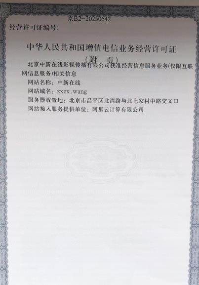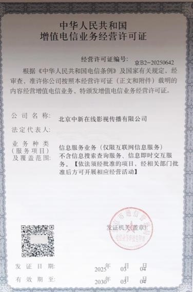 中新在线取得互联网信息服务许可证啦 2025年3月13日,中新在线收到了北京市通信管理局发来的《中华人民共和国 增值电信业务经营许可证》: 经营许可证编号: 京B2-20250642 根据《中华人民共和国电信条例》及国家有关规定,经 审查,准许你公司按照本经营许可证(正文和附件)载明的 内容经营增值电信业务,特颁发增值电信业务经营许可证。 公司名称: 北京中新在线影视传播有限公司 业务种类 (服务项目) 及覆盖范围: 信息服务业务(仅限互联网信息服务) 不含信息搜索查询服务、信息即时交互服 务。[依法须经批准的项目,经相关部门批 准后方可开展相应经营活动] |