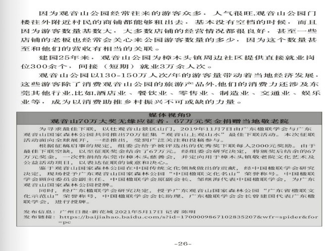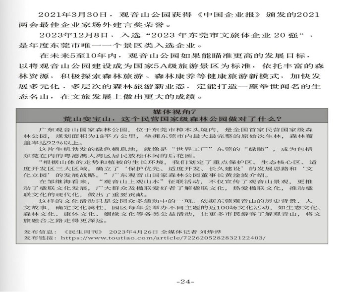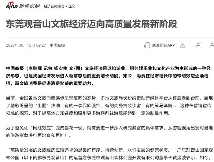 文章称:东莞观音山的文旅经济迈向高质量发展新阶段,主要通过文化创意创新来创造社会价值和经济价值,进而带动产品和服务不断升级换代,持续推进旅游业与林业、服务业、文化产业等的深度融合,促进新型业态不断涌现。观音山始终牢牢守住森林生态底线,坚持生态文化双轮驱动,坚持创新驱动、优质发展、以文塑旅、以旅兴文,通过举办形式多样的文旅活动,塑造了远近闻名的“文化名山”品牌,走出了一条生态优先、绿色发展的特色旅游道路。