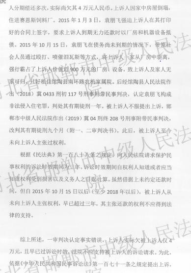 | 千万厂房被抢占抵债后仍被判决还款,馆陶县农民企业家刘保廷迎来曙光 独立撰稿人 李海波 河北馆陶县的刘保廷的人生可谓跌宕起伏:从一个拥有二厂房的民营企业家到打工为生,从千万家产到无家可归,从开奥迪车到开老年代步车…… 这一切的变故源于借了高利贷还了只有4万时被债主带人强占厂房住房。 借款36万元还了只剩几万 被强占价值千万厂房作为抵债?! 刘保廷原本是一个农民企业家, 本世纪初在大刘庄村村西占地8亩建了赛恩斯饲料厂,2014年1月又在本厂院内建设馆陶县福瑞轩金属丝科技有限公司。 ![]() 价值200多万元的厂房设备情形,被强占后不知所踪 公司经营期间,刘保廷向馆陶镇刘沿村人袁某飞借了36万元钱,利息五分,每月结息,没约定还款时间。到2014年底,刘保廷分三次还了10万元;2015年10月1日前又分4次还了11万元。但每次还款后,他要求袁某飞归还借条,袁总是说等彻底还清了才能把欠条给他。 ![]() 袁某飞以还欠其本息合计20万元为由,于2014年9月17日强迫刘保廷签订了《转让协议》,将自己的工厂场地和机器设备作价30万元,用于偿还欠袁某飞的债务。 此前,经山东舜天信诚资产评估有限公司对该厂资产评估:赛恩斯饲料厂部分固定资产价值8866700元。 ![]() 2014年8月做出的《资产评估报告》:部分资产价值886万6700元 2015年1月3日,刘保廷正在医院输液,袁某飞找到医院,拿出一份提前打印好的合同说,不管死活今天不签字就把机器当废铁卖掉。刘保廷输完液到了袁的办公室,看完合同后表示,整个厂子抵押给你这点钱不合适,不签。袁某飞就说不签就出不了这个门!僵持了几个小时,刘保廷身体经不起折腾,为了保命才不得不在合同上签了字。合同大意是:如一年内还不清袁某飞的借款,就以厂房和机器设备抵债。 ![]() 2014年除夕下午,袁某飞带着一帮社会人员,开着大货车、吊车赶到赛恩斯饲料厂,以讨债为名,在刘保廷的大门和墙上挂着两条红色条幅,上面写着“刘保廷还我血汗钱”, 致使公路上堵塞500米远,一直闹到大年初一凌晨一点。 刚过完年,袁某飞就逼刘保廷还钱,刘保廷把无奈之下自己仅有的3亩地卖了,还了袁某飞11万元。 当年夏天,因家中房屋倒塌,刘保廷一家搬住进赛恩斯饲料厂生活居住。 在11间住房外,刘保廷用围栏与厂房隔开。2015年9月,袁某飞让刘保廷的儿子刘宪华(金属拉丝科技公司法人)用贷款给他买辆车,算是还利息,刘保廷当时没有同意。 2015年10月15日,袁某飞在债务尚未到期的情况下,开车到刘保廷的赛恩斯饲料厂,问刘凑够钱了没,刘说没凑够,袁某飞就轰赶刘保廷和家人出去。刘刚说了一句说:“朋飞,我就欠你这点钱,你就把我撵出去啊 ?”袁某飞随后拿起茶几上的一个玻璃烟灰缸,砸到了刘的头上,还一脚踢在刘保廷裆部,致其当场晕倒。 刘保廷的家人打电话叫120救护车把刘保廷拉往医院后,袁某飞还说:“不服的话,我把你们全家都揍喽,你们愿意去哪告就去哪告!” 晚上7点左右,刘保之妻张巧文、之女刘新霞、刘新厂从医院看护刘保廷后回到厂里,袁某飞带着其弟弟袁跃飞和两个社会人员, 再次来到厂里,拿出催泪瓦斯强行驱赶刘的家属离开厂子,致使张巧文当场晕倒。 刘保廷受伤后在馆陶县人民医院住院治疗12天,支付医疗费6086.80元。老伴张巧文在中医院也检查出呼吸道感染。 刘家人报警后,派出所派人到场,简单问了问情况就走了。 刘保廷住院期间,袁某飞再次将赛恩斯饲料厂大门锁住, 并用自己的轿车在里面顶住大门不让人进去,还在院子里吊了一个活动板房,让自己的手下老爹住在里面, 说这个厂子是他家的了。 张巧文说,厂子里还有她们家的玉米1700斤左右,水泡的都发霉了;孙庄的邻居家也有几万斤玉米在厂子里放着,邻居去拉玉米的时候,袁某飞催着拉玉米的工人赶紧离开。 某日,村民刘建杰想往厂里停车, 发现们打不开,就在厂子外面喊刘保廷儿子宪华的名字,袁跃飞从厂里出来后于刘建杰发生争执,于是,操起一根铁棍把刘建杰打伤,事后经法医鉴定,刘建杰小腿骨骨折,构成轻伤。然而,神通广大的袁某飞竟然没受到任何处罚。 ![]() 福瑞轩金属丝科技有限公司部分设备(来源于邯郸市中级法院证据) 2018年夏天,袁某飞将厂房租给大刘庄的刘某,让其在厂里收购粮食。 至今,该厂的大门仍被袁某飞用一把大铁锁锁着,而围墙因年久失修出现多处倒塌。院里更是杂草丛生、蛇鼠乱窜。 4人喷射催泪瓦斯强占厂房致刘家人无家可归 仅一人被判刑 2015年11月9 日,馆陶县公安局行政处罚决定,对袁某飞行政拘留8日,并处罚款200元。但该处罚并未得到实际执行,经刘保廷多次信访,2017年4月5日才实际执行。 上千万的企业被霸占了,一家人无家可归而一直在外租房,没有生活来源。而打伤和使用催泪剂的四人仅被行拘了事,让刘家人感到绝望。针对袁某飞涉嫌侵占公民财产犯罪一事,刘保廷多次向馆陶县公安局报案和反映,请求该局立案、依法追究袁某飞等人的刑事责任,但是馆陶县公安局却以经济纠纷为由,迟迟不予刑事立案,并作出《不予立案通知书》。经过行政复议,馆陶县公安局作出决定意见仍维持不予立案。刘保廷不服,向邯郸市公安局申请复核。 不服该处罚,刘新芝走上了信访之路,刘新芝不堪精神打击,两次服毒自杀未遂。 2017年8月,邯郸市公安局法制支队受理了该案。 2017年8月17日,袁某飞被传唤到案。2017年8月,袁某