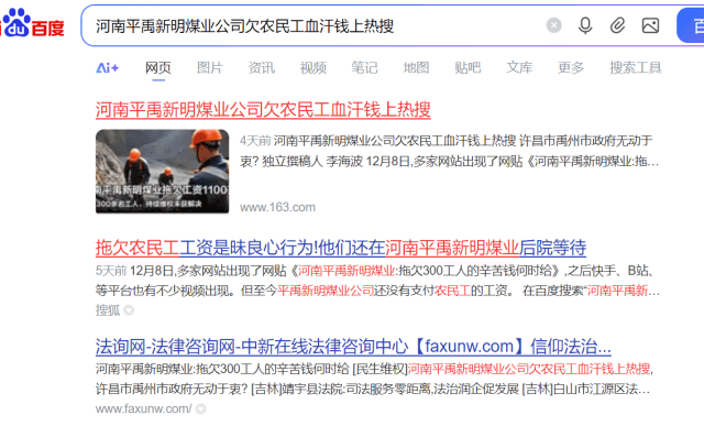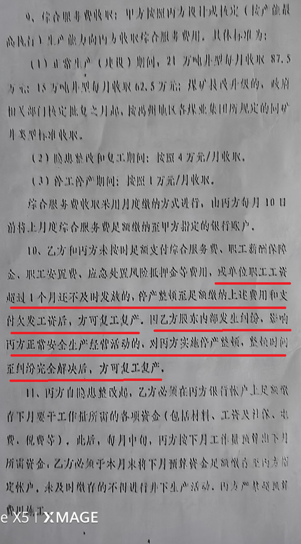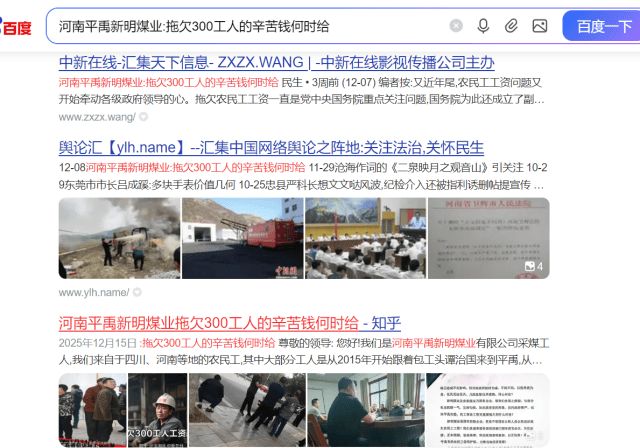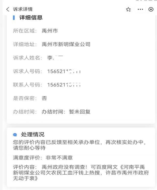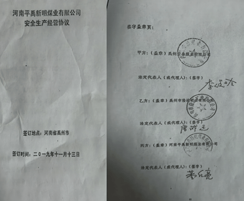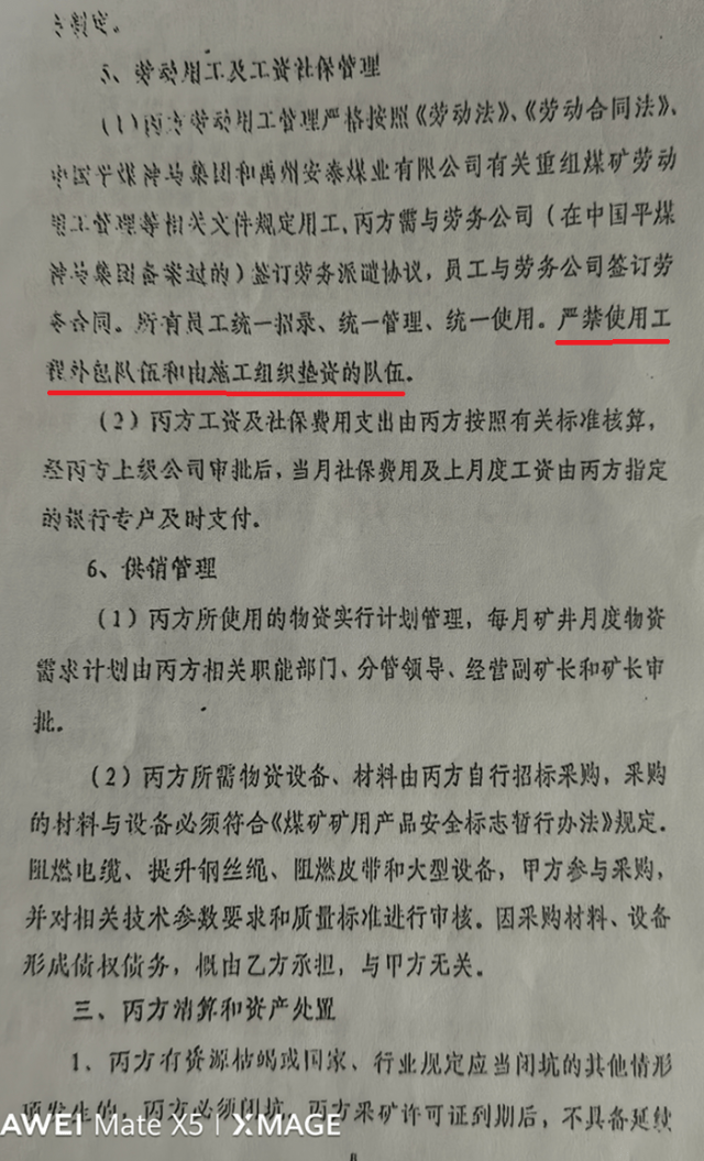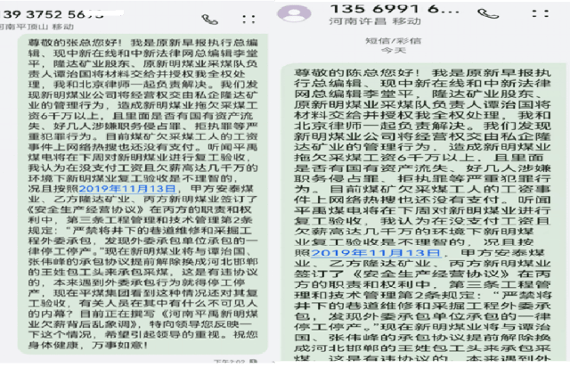 平禹新明煤业问题重重,平煤集团执意验收为哪般 独立撰稿人 李海波 12月8日,法询网发布了《河南平禹新明煤业:拖欠300工人的辛苦钱何时给》,之后多家网站予以转发,一时上了百度热搜。由于欠薪问题,平禹新明煤业之前被停工停产。而在农民工工资没解决的情况下,平煤神马集团不顾舆论及民工呼声,竟在29日对新明煤业进行复工复产验收...... 河南平禹新明煤业公司农民工代表签名 欠薪没解决 工队没结算 引发网络舆情 谭治国等人从2015年开始承包平禹新明煤业的采煤,2023年4月27日,隆达矿业再次和张卫锋、谭治国签定为期3年的协议,将平禹新明煤业公司的井上、下的安全生产工作全部由乙方负责管理。2023年8月7日,新股东实控人杨广西签署补充协议,对隆达矿业与谭治国施工队签订的协议进行了确认。 在此期间2023年8月20号至2025年6月,谭治国施工队共计生产原煤15.1万吨交给实控人杨广西,两年期间共计生产只有13个月,煤矿经营问题持续恶化,最终导致矿上再次欠张卫锋及谭治国工队工资,造成停工停产工人多次上访。 但在今年3月31日,杨广西鼓动谭治国说准备找法人要钱让他签下了解除合同的通知,但之后杨广西就另外找了河北人王先生作为新明煤业采煤施工队,并入驻煤矿。但对于谭治国工队的采煤15万吨煤却不按协议结算付款。 今年杨广西将谭治国等人的施工队撵出而另外找了河北邯郸的王姓包工头入场,面临工队被排挤且无法对账结算的困境,施工队合伙人李庆森、张卫锋于今年10月18日向领导递交了《关于隆达矿业有限公司相关问题的反映材料》,对隆达矿业当前的混乱局面及股东的违规行为进行投诉,认为多人存在挪用公司资金、职务侵占行为,已严重违反《中华人民共和国公司法》《中华人民共和国刑法》等相关法律法规规定,恳请领导尽快介入调查。 由于没人理睬,于是农民工找到法询君委托在网上发布了《河南平禹新明煤业:拖欠300工人的辛苦钱何时给》, 12月15日,撰稿人代农民工代表在河南省政务平台的“豫事办”上做了反映。 12月19日上午9:07,自称禹州市人社局的工作人员给撰稿人打来电话,说反映不实。当日下午15:32电话037412345给撰稿人来电话表明她是政务平台的,问有没有政府部门来电话,而后问人社局的答复了去现场调查没有。撰稿人联系周姓农民工代表回复是人社局在乱说,没有调查他们。 直到26日,撰稿人也没有等到“豫事办”的回复。便再次发布了《河南平禹新明煤业公司欠农民工血汗钱上热搜,许昌市禹州市政府无动于衷?》 28日,撰稿人收到了“豫事办”的回复,如禹州市人社局人员来电时的如出一辙:“您好,省级12345热线收到您的诉求后,立即转派许昌市12345热线,许昌市12345政务服务便民热线于2025年12月15日派发至禹州市人民政府办理,禹州市人民政府办理结果回复如下:一、办理过程12月19日,禹州市人力资源和社会保障局劳动保障维权服务中心通过电话与投诉人沟通核实具体情况。诉求人反映情况不属实。据诉求人反映:拖欠其于其他工友2024年10-12月约1100余万元。二、办理结果经核实,矿井没有叫李堂平的职工,工资册上也没有此人,反映人反映情况不属实。今年以来,由于煤炭市场价格形势低迷,矿井产量不足等原因,导致矿井拖欠职工工资。2025年5月29日矿井根据上级公司的会议精神停工放假。由于拖欠职工2024年12月至2025年5月6个月约900万元工资,截止2025年11月30日,矿井工人工资已经发放至2025年5月份。截至目前所欠职工工资约834万元已发放到位,尚有66万工资未发放,主要原因是个别职工未到矿实名签字或者是名字和银行卡不对照,待矿井复工验收通过后,陆续发放该部分工资。矿井不存在拖欠职工工资的问题。矿方表示如有造谣、攻击、抹黑、肆意诽谤矿方声誉的行为,将依法追究其法律责任。三、答复诉求人情况禹州市人社局于2025年12月19日联系该反映人,已告知其处理意见。” 对于撰稿人对禹州市人社局和“豫事办”工作人员说的是帮农民工反映情况,竟然还是如此回复,真是令人相当无语啊! 于是撰稿人当即评价为“极度不满意”,撰稿人在今天登录发现显示为“处办中”了。 而由于农民工代表不服撰稿人反馈给他们的答复情况,今天农民工代表再次到郑州市,准备向省信访局投诉,但被禹州市的干部接访劝回,表示3日内协商解决。 合同约定不能承包 否则停工停产 2019年11月13日,甲方安泰煤业、乙方隆达矿业、丙方新明煤业签订了《安全生产经营协议》。 在丙方的职责和权利中,第三条工程管理和技术管理第2条规定:严禁将井下的巷道维修和采掘工程外委承包,发现外委承包单位承包的一律停工停产。 之后的第四条财务管理条款规定:严禁使用工程外包队伍和由施工组织垫资的队伍。 看看这个第十条规定:乙方和丙方未按时足额支付综合服务费、职工薪酬保障金、职工安置费,应急处置风险抵押金等费用,或单位职工工资超过1个月还不及时发放的,停产整顿至足额缴纳上述费用和支付欠发工资后,方可复工复产。因乙方股东内部发生纠纷,影响丙方正常安全生产经营活动的,对丙方方实施停产整頓,整顿时间至纠纷完全解决后,方可复工复产。 而谭治国就是乙方隆达矿业的股东,目前因为采煤队的资金结算股东内部发生纠纷,还没有解决。 多人发短信 阻止不了对平禹新明煤业的验收 26日,在得