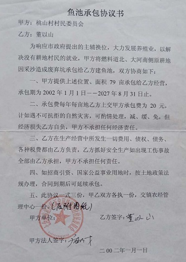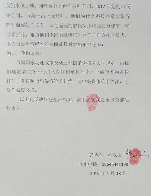求助信 2018年3月,七台河动迁办让村里通知我到我家承包土地动迁,量了一天后就撤离了,隔几天,村里又通知我研究动迁,这次主持动迁单位不是市动迁办,是桃山区棚改办,棚改办对我承包土地及附着物登记造册后,让我在清单上签字,同年5月12日,桃山区防汛指挥部突然对我下达限期清除障碍通知书,让我自行清除我承包三十多年土地上鸡舍、猪舍、看护房、山庄、养鱼池、蔬菜大棚等地面的附着物,我当时与防汛指挥部的人发生争执,也未同意自行清除,并拒绝签字。5月18日,区棚改办带着推土机,铲车强行将我鸡舍、猪舍、看护房等拆除面积779.5平方米。同时被强行拆除的还有几十家村民的地面附着物。6月,我们被强拆村民开始上访,区政府强拆违法行为停止。10月3日,棚改办召集我们研究下一步拆迁评估。让我们选择第三方评估机构,在三家评估公司我们当时选择了哈尔滨市一家评估公司。可是,由于哈尔滨评估公司依据市场价格对我们尚未动迁的地面附着物进行评估,与政府欲给我们所谓成本价相差太多。只用他们评估一天就撵走了。然后用本市一家评估公司进行评估,评估出的价格比市场价低出两倍。有的连成本价都没达到。如养鱼池每米作价35~50元。成本价最少150元,连推一平方米机动车油的费用都不够。更为严重的是棚改办对我们的看护房,鸡舍、猪舍、平房、农家乐、山庄、树木等不给评估,认定这些建筑是违章建筑,不给补偿。同时,对于定价拆迁的标的物让我们转让给七台河市城投公司,不让我们和市政府直接签订补偿协议,其手段十分卑劣,真是坑农害农,损害农民利益的违法杰作。希望在全国各大媒体给予曝光。 村委收到董以山的房号款出具的收据 废弃地承包合同 农业部制发的水域滩涂养殖使用证 2019年1月18日 七台河市土地管理局颁发的用地申请书 鱼塘承包协议书 |