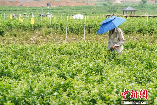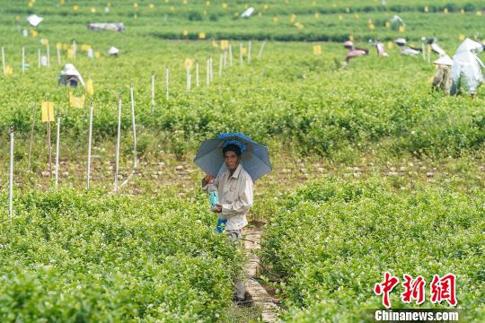 花农在35摄氏度的高温下“全副武装”采摘茉莉花 陈冠言 摄