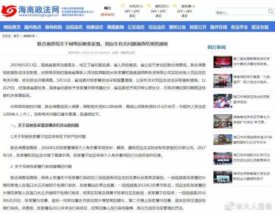 海南政法网截图 2019年5月13日,海南省委政法委牵头,成立了省纪委监委、省人民检察院、省公安厅参加的联合调查组。联合调查组依据各自法定职责,对网络反映的海南省高级人民法院原副院长张家慧和海南迪纳斯投资有限公司实际控制人刘远生的有关问题,依纪依法开展调查。5月31日,省监委对张家慧依法采取留置措施,公安机关对刘远生依法采取强制措施。11月29日,经海南省委批准,海南省纪委给予张家慧开除党籍处分,省监委给予其开除公职处分,对其涉嫌犯罪问题移送检察机关审查起诉。 对网络反映的问题,联合调查组深入调查,调取相关资料1300余册,查阅公司账务资料15.6万余页,与相关人员谈话1200余人(次)。目前有关问题已基本查清,现通报如下。 一、关于反映张家慧涉嫌违纪违法的问题 1。关于反映张家慧不如实申报名下财产的问题 联合调查组查明,2016年1月张家慧填报个人有关事项报告时,瞒报、漏报刘远生实际控制和参股的26家公司。2017年3月,张家慧和刘远生办理了离婚手续。张家慧不如实申报个人有关事项的行为违反组织纪律。 2。 关于反映张家慧打麻将赌博的问题 联合调查组查明,网络上传播关于张家慧打麻将的三段视频系刘远生的生意伙伴易某武偷拍。一段视频是张家慧的外甥刘某等人在海口水云天咖啡厅包厢打麻将,张家慧站在旁边观看;一段视频是2015年2月春节前后,刘远生和张家慧的外甥刘某等人在海口水云天咖啡厅包厢打麻将,结束后刘某及其妻子陈某玲正在数钱,张家慧不在现场;一段视频是2016年6月20日,张家慧与同事、朋友一同前往重庆市参加其外甥贺某的婚礼,第二天晚上张家慧与同事、朋友在所住酒店包厢打麻将。另查明,张家慧自2011年学会打麻将后,经常召集人员打麻将赌博,其行为违反治安管理处罚法。 3。关于反映张家慧、刘远生在海口水云天小区内有一座湖边会所,经常宴请他人的问题 联合调查组查明, 2005年底,海南唯舍房地产开发有限公司(以下简称唯舍公司)在其滨涯湖边的项目用地上建设了一栋三层建筑,作为开发水云天小区一期的售楼处使用。2014年4月,刘远生将该建筑的第一、第二层作为其公司的办公室,将第三层进行高档装修,设有会客厅、餐厅,不对外营业,属于带有私人会所性质的接待场所。张家慧、刘远生不时在此宴请他人。张家慧的行为违反中央八项规定精神和廉洁纪律。 4。关于反映张家慧不正确履行职责,拒不执行最高法督办通知的问题 联合调查组查明,2005年海南省第一中级人民法院(以下简称海南一中院)裁定,将三亚市开发建设总公司(以下简称三亚建总公司)名下的“晋泰大厦”1419.2625㎡的房产抵偿给海南思迈药业有限公司(以下简称思迈公司)。由于案件多年得不到有效执行,2018年思迈公司两次向最高法反映,最高法挂网督办,海南省高院要求分管执行工作的张家慧主持开展该案件的协调工作。2018年7月26日张家慧主持召开协调会议,提出三亚建总公司以现金偿债的方式解决该债务,但思迈公司不同意,仍要求三亚建总公司以房产抵债。目前没有证据证明张家慧在该案处理过程中存在违纪违法问题。 5。关于反映张家慧干预文昌华都物业管理有限公司(以下简称华都公司)诉讼案件的问题 联合调查组查明,王某雄名下的华都公司与海南金瑞隆实业有限公司(以下简称金瑞隆公司)存在合同纠纷,双方于2015年1月在文昌市公证处进行债权债务公证。当月,金瑞隆公司向海南一中院申请强制执行公证债权文书。2016年7月王某雄提出执行异议,被海南一中院裁定驳回。后王某雄多次复议、诉讼,均被海南一中院、省高院驳回。目前没有证据证明张家慧干预本案复议、诉讼工作。 6。关于反映张家慧干预李某华案件,致其案件由海口市龙华区人民法院(以下简称龙华法院)移送至省高院,诉讼费提高至208万元,张家慧还利用关系网干预李某华户籍恢复的问题 联合调查组查明,2011年李某华因股权纠纷将新南洋大酒店起诉至龙华法院,2013年李某华追加诉讼请求,要求确认新南洋大酒店持有的海南海伊特经济技术开发有限公司50%股权归其所有。因为李某华追加诉讼的50%股权标的额约为4亿元,龙华法院按规定将该案移送有管辖权的省高院。案件移送至省高院后,根据法院相关规定,原告缴纳诉讼费的计费方式由按件计费变为按标的额计费,李某华缴纳的诉讼费因此提高至208万元。 联合调查组查明,2014年儋州市公安局发现李某华真实户籍在广东省吴川市,便将其在儋州市的重复户籍注销。于是,李某华请求省高院中止审理上述股权纠纷案件,同时提起行政诉讼,要求撤销儋州市公安局注销其户籍的具体行政行为。期间,李某华为保留其儋州户籍,主动注销了其广东吴川户籍,导致其成为没有户籍的人。儋州市公安局已协调吴川市公安局,办理李某华户口的恢复手续。目前没有证据证明张家慧干预李某华案件审理和李某华户籍恢复事宜。 二、关于反映张家慧、刘远生巨额资产的问题 7。关于反映张家慧、刘远生夫妇直接或间接控制多家公司,拥有巨额资产的问题 公安机关按照法律规定,对张家慧、刘远生个人资产情况,以及刘远生实际控制和参股的公司情况进行了调查,并聘请专业公司进行了资产评估。现查明,与刘远生相关联的公司共计36家,已转让3家、注销或吊销8家,目前刘远生实际控制或参股的公司25家。