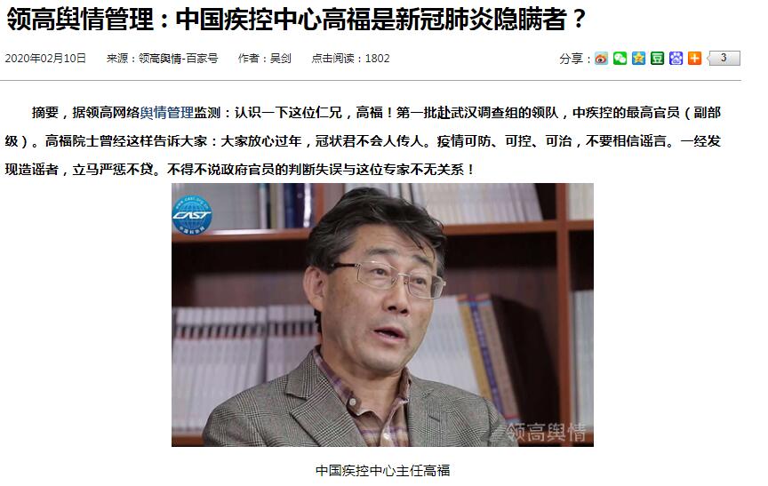 独立撰稿人 李海波 2月10日,湖北省卫健委书记、主任双双被免职,众所周知是因为新冠病毒肺炎疫情的问题。消息一出,大快人心。  但是,要说的是,对于新冠病毒疫情,中疾控中心主任高福就国家卫健委等人也难辞其咎。2月5日,“bj作家肥猪满圈”公众号发文《高福先生,您人生的路,还有吗?》,之后此文疯传,瞬间突破10万100万甚至1000万读者人次。 文章显示高福先生其实早就知道武肺人传人,而且一发,可能不可收拾。而身为这个国家国家级疾病预防控制 与公共卫生技术管理和服务的公益事业单位的最高长官,他知情后做了什么?没见中疾控做出反应。只是在世界顶级的学术期刊“新英格兰通讯”上(能在《新英格兰通讯》上发表一篇论文,这都是很多学者们一生梦寐以求的事儿。),有一篇署名GeorgeGao(高福)的高水平论文震惊世界。这篇1月22号投稿的论文的内容,就是“论冠状君”的。根据论文内容,即从1月4日之前的感染病例,就已经判断出武肺所感染的病毒属于传染病。这篇论文预计:“通过分析12月10日至1月4日期间发病病例的数据,来估算疫情的增长速度,因为我们预计在12月13日武汉疫情正式宣布之后,发现的感染比例将很快增加”。bj作家肥猪满圈分析其1月22日投稿,一定是在更早的时间就已经完成了论文的核心内容的写作分析和研究,而且已经得到了科学有效的论证,即——新型冠状病毒,是高流行传染病这一论点。对此bj作家肥猪满圈问高先生,您首先是科学家还是政府官员?如果,您醉心于做研究,那您就去研究所专心做研究不好吗?别在疾控中心主任的位置上耽误全人类(现在已经不是全国人民了,而是全地球所有国家都面临风险)。 高流行传染病为何没控制,甚至也没宣布控制?而且直到19号晚,已经疫情肆虐几近无法收拾,钟南山先生才宣布人传人的呢? 之后该文章投诉了,作者删除了那篇文章。删除时点击率是1064万。