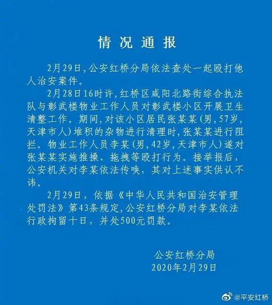 情况通报 2月29日,公安红桥分局依法查处一起殴打他人治安案件。 2月28日16时许,红桥区咸阳北路街综合执法队与彰武楼物业工作人员对彰武楼小区开展卫生清整工作。期间,对该小区居民张某某(男,57岁,天津市人)堆积的杂物进行清理时,张某某进行阻拦。物业工作人员李某(男,42岁,天津市人)遂对张某某实施推搡、拖拽等殴打行为。接举报后,公安机关对李某依法传唤,其对上述事实供认不讳。 2月29日,依据《中华人民共和国治安管理处罚法》第43条规定,公安红桥分局对李某依法行政拘留十日,并处500元罚款。 公安红桥分局 2020年2月29日 来源:@平安红桥 |