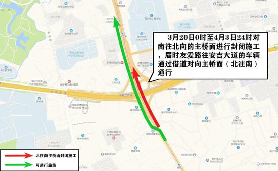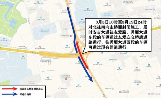 随着复工复产的有序推进,南宁市部分路段市政项目陆续恢复施工。3月5日上午10点起,西乡塘区友爱立交桥将进行围挡施工,对市民出行带来一定影响。交警部门提醒广大驾驶人,请关注施工路段信息,提前规划出行路线,做到安全文明通行。 友爱立交桥南北向主桥面伸缩缝改造工程 ![]() 3月5日10点至3月19日24点,对北往南向主桥面封闭施工,届时安吉大道往友爱路、秀厢大道东段的车辆通过友爱立交桥底道路通行,往秀厢大道西段的车辆可通过现有匝道通行。 ![]() 3月20日0点至4月3日24点,对南往北向的主桥面进行封闭施工,届时友爱路往安吉大道的车辆通过借道对向主桥面(北往南)通行,安吉大道北往南方向的车辆按照第一阶段通行方式实施。 友爱医院拆除工程 ![]() 3月5日10点至4月15日,对友爱路右转进入友爱立交桥底的便道进行封闭,禁止机动车通过便道进入桥底,非机动车和行人可通过预留便道通行。施工方将根据施工需要对非机动车和行人便道实行短时间封闭,请非机动车和行人服从现场管理人员指挥引导。 施工期间,由友爱路(南往北方向 )右转往秀厢大道东段的车辆可通过现有匝道往秀灵立交桥底掉头,或者直行前往安吉大道后选择周边道路绕行。 友爱立交桥东北角便道 (交警一大队门口至城管综合执法支队门口段) 本月起,对友爱立交桥东北角便道封闭后进行污水管网施工,工期约3个月。施工期间禁止机动车通行,非机动车可通过预留便道通行。需通行施工路段的机动车,可根据沿线交通指引标志牌,通过秀安路、秀灵立交桥、友爱立交桥底道路、安吉大道等道路通行。 来源:南宁交警微发布 |