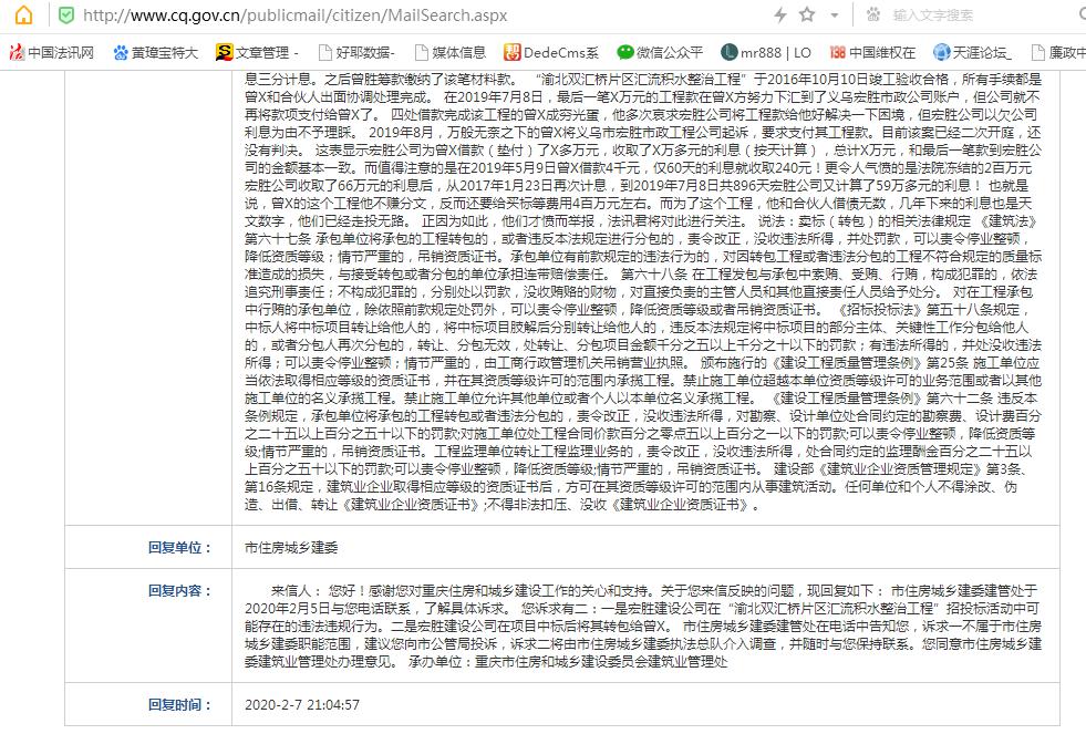 重庆渝北区建委:宏胜公司卖标过了追溯期无法处理 独立撰稿人 李海波 2020年1月5日,法讯网发布了《义乌市宏胜市政工程公司被曝卖标,高利坑惨承包人》,之后搜狐网、腾讯新闻、一点资讯、凤凰网等百家网站纷纷转发,引起广大网友关注,被称为工程卖标曝光第一例。 之后法讯君将该情况网上向重庆市市长信箱等单位投诉,目前显示“信件已受理,正在办理中。”。 对于围标情况,法讯网向重庆市公共资源交易监管局提交了投诉,其答复是:“根据“三定”,我局的职责主要是对市级审批、核准的依法必须招标的工程建设项目的招标投标活动实施监督管理和执法。你来信中提到宏胜建设公司2014年在渝北双汇桥片区汇流积水整治工程围标卖标的问题,根据你的叙述,该案已经二次开庭,还没有判决。依据司法最终原则,不属于我局职责范围,建议你依法通过司法途径维护合法权益。重庆市公共资源交易监督管理局 2020年1月8日” 而线人卢某某在文章发出后不久即电告撰稿人,宏胜在重庆的一次招投标中被请出了现场:他们的投标资格被取消了。 2月7日14:29,17130932***来电说是重庆渝北区建委的,对于宏胜卖标围标,他们在调查处理,因为疫情下在家办公就用手机打来。其表示宏胜卖标肯定违法了得处理,至于围标是发改委的事情。到时候他们会将调查处理情况发邮件给我。 经查询重庆市政府网站在2月7日晚上9时如下答复:来信人:您好!感谢您对重庆住房和城乡建设工作的关心和支持。关于您来信反映的问题,现回复如下:市住房城乡建委建管处于2020年2月5日与您电话联系,了解具体诉求。您诉求有二:一是宏胜建设公司在“渝北双汇桥片区汇流积水整治工程”招投标活动中可能存在的违法违规行为。二是宏胜建设公司在项目中标后将其转包给曾X。市住房城乡建委建管处在电话中告知您,诉求一不属于市住房城乡建委职能范围,建议您向市公管局投诉,诉求二将由市住房城乡建委执法总队介入调查,并随时与您保持联系。您同意市住房城乡建委建筑业管理处办理意见。承办单位:重庆市住房和城乡建设委员会建筑业管理处 2月27日10:25,渝北区建委15823473144来电问工程具体位置等情况,说需要详细的一些情况,我让他加微信后将合同书等材料发给了对方,并告知了举报人曾胜和线人卢某某的联系方式。 3月5日16:01,渝北区建委来电告知说工程在2016年就完工了,根据《行政处罚法》第二十九条规定过了2年追溯期,他们无法对其进行处理,否则就是建委违法。你们能否给我发来一个书面的答复情况?他说等请示领导后再答复。10分钟后其来电告知说是重庆市建委执法总队发函让渝北建委调查处理,他们已经书面回复给总队了,只是电话告知我就行了,如要书面的就找执法总队...... 对于渝北区建委如此行径,法讯君表示不解:既然认定超过追溯期,那市建委执法总队就没有必要发函让你们调查呀?!你们调查了近一个月,就拿出法律说过了追溯期,你们在刚开始看完事情经过就明白这个时间点啊!如此浪费你们的人力,浪费本人的时间,有意思么?! 另据了解,宏盛建设公司卖标时的当事人邱敬元不是宏胜员工,而是在重庆长期以围标后卖标为业,法讯君将进一步关注。 邱敬元卖标协议 附《行政处罚法》二十九条:违法行为在二年内未被发现的,不再给予行政处罚。法律另有规定的除外。前款规定的期限,从违法行为发生之日起计算;违法行为有连续或者继续状态的,从行为终了之日起计算。 《义乌市宏胜市政工程公司被曝卖标,高利坑惨承包人》腾讯新闻部分网友评论: 金华通用(JHTYGEAR)变速箱:项目转手就有14%的利润,桥塌了,路陷了你还会觉得奇怪吗 曲泽亮 : 这个社会让人无语 人生豪迈:这样的事屡见不鲜,在行业上已比比皆是,是行业规则 行星:政府要严厉打击工程挂靠行为!这是工程腐败根源!【"喷子太多了绕道走"回复 : 人家是一伙的】 井中月^0^:太贪了。。。不给人活路 &PP& 这公司完蛋了 冬月十六:就是别把人逼到绝路…… 平安就是幸福:就怕披着合法外衣的 狼 吟£风♂逍:好狠啊 半聋半哑半糊涂:查 易伯:吃相太难看,逼得人家跟你同归于尽,最终吃进去的还不得吐出来,害人终害己。 田园观景:这种人怎么被人弄死都不知道,狗急了也会跳墙,自己合理的诉求无法得到满足弄的没饭吃,那黑心的转包商离死期也不远了! |