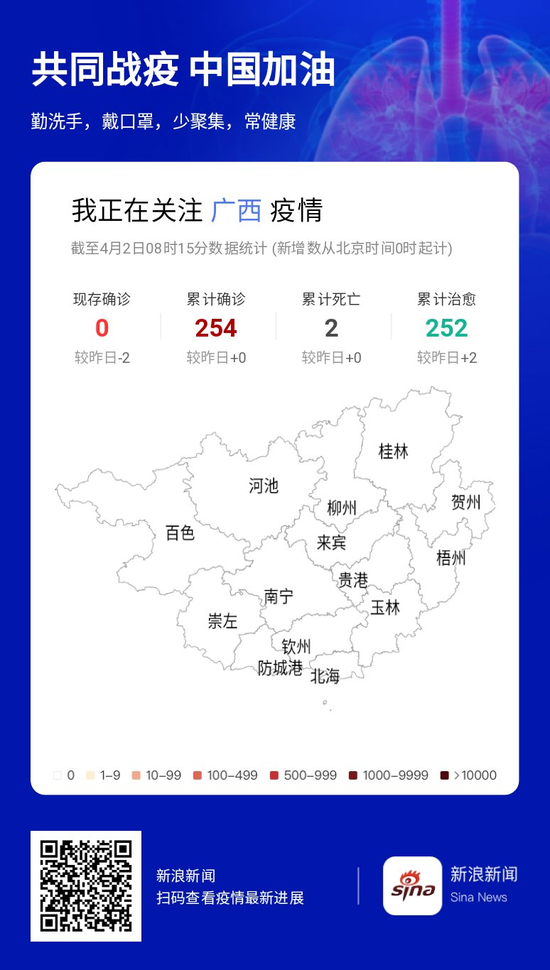 4月1日0至24时,我区无新增确诊、疑似病例,无新增死亡病例。2例境外输入确诊病例治愈出院。全区累计报告确诊病例254例,治愈出院252例,死亡2例。
