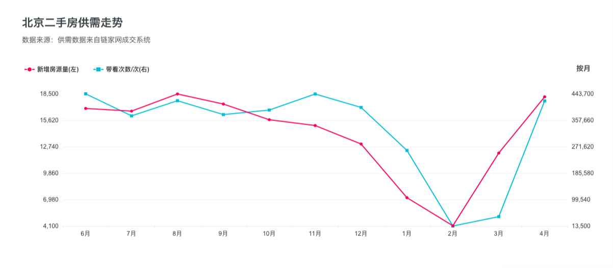 根据链家网的数据,今年2月份,北京二手房新增房源量和带客量都出现大幅下降,3月份的市场开始复苏,至4月,新增房源量、带看次数分别为18172套、42万次,均恢复甚至超过去年各月份的平均水平。