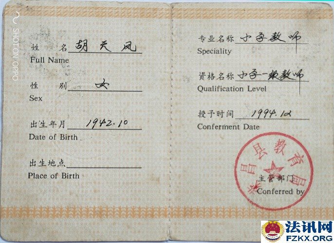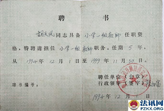 荣昌县教育局《荣教人发【1993】5号》文件关于胡天凤同志可享受正式民师待遇的通知,工教龄从1963年3月算起。1994年9月胡天凤被清升镇党委、清升镇政府评为先进教师;1994年12月4日,清升镇甘桥完全小学聘胡天凤为一级教师;1994年12月,重庆市人民政府授予胡天凤为小学一级教师,并颁发专业技术资格证书;1995年12月8日,荣昌县教育局为胡天凤颁发了小学一级教师证。