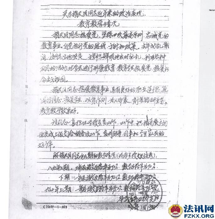1990年荣昌县清升镇甘桥完全小学作出《关于胡天凤同志近年来的政治表现、教育教学情况》,称胡天凤同志热爱党,坚持四项基本原则,忠诚党的教育事业,自觉执行党的路线,旗帜鲜明地反对动乱,利用各种不同的活动,对学生进行形势教育,教育学生热爱党,热爱社会主义祖国。还称胡天凤热爱教育事业,具有良好的职业道德,能团结同志,热爱学生,以身作则,为人师表,刻苦钻研业务,教育教学效果好。该同志一直担任学校负责工作,受到领导、同事和学生家长的好评。点校交叉统考情况:1989年上期,三年级语文及格率为90%,数学及格率为90%;下期,一年级语文及格率92.1%,数学及格率为95%;1990年上期,一年级语文及格率为95.2%,数学及格率为93.5%。