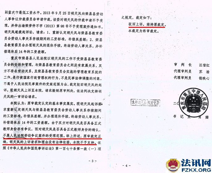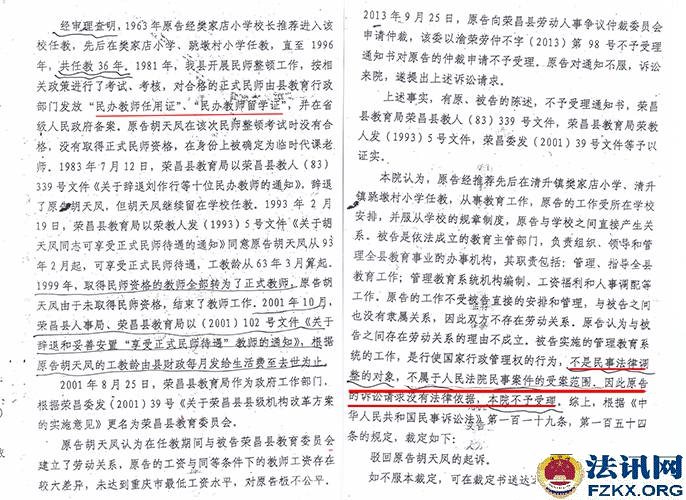 2013年,胡天凤将荣昌县教委诉讼到法院,要求教委以小学一级教师待遇,重新认定与教委劳动人事关系存续期间的工资标准,补偿其差额,办理退休手续,终结劳动人事关系,并补偿退休后14年的工资差额 ,法院认为不属于民事案件的受理范围,二审也驳回上诉、维持原判。