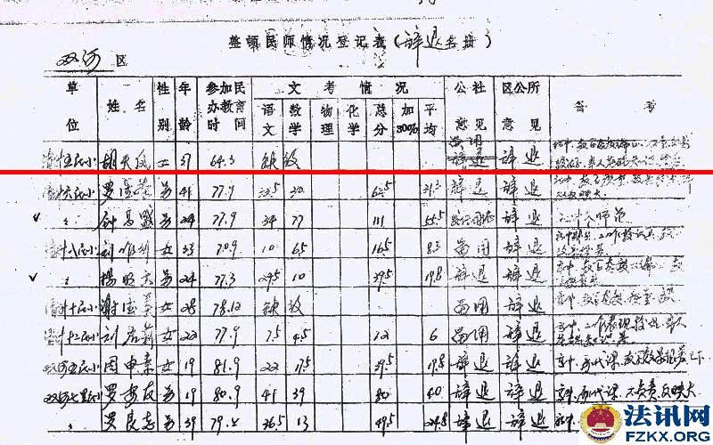 胡天凤还未进入考场,突然生病,不能坚持答卷,可查阅试卷注释。清升公社民办教师管理小组在辞退名册上认定的是“缺级”,意见是“留用”,双河区公所意见是“辞退”,备注胡天凤是初中文化,教学态度端正,质量效果较好,本人基础知识较差。