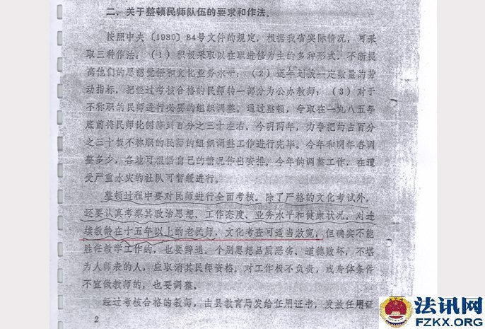 1981年全国民办教师整顿。《川府发【1981】129号》文件,要求对民师进行全面考核,除严格的文化考试外,还要认真考察其政治思想、工作态度、业务水平和健康状况,对连续教龄在15年以上的老民师,文化考察可适当放宽,但确实不能胜任教学工作的,也要辞退。