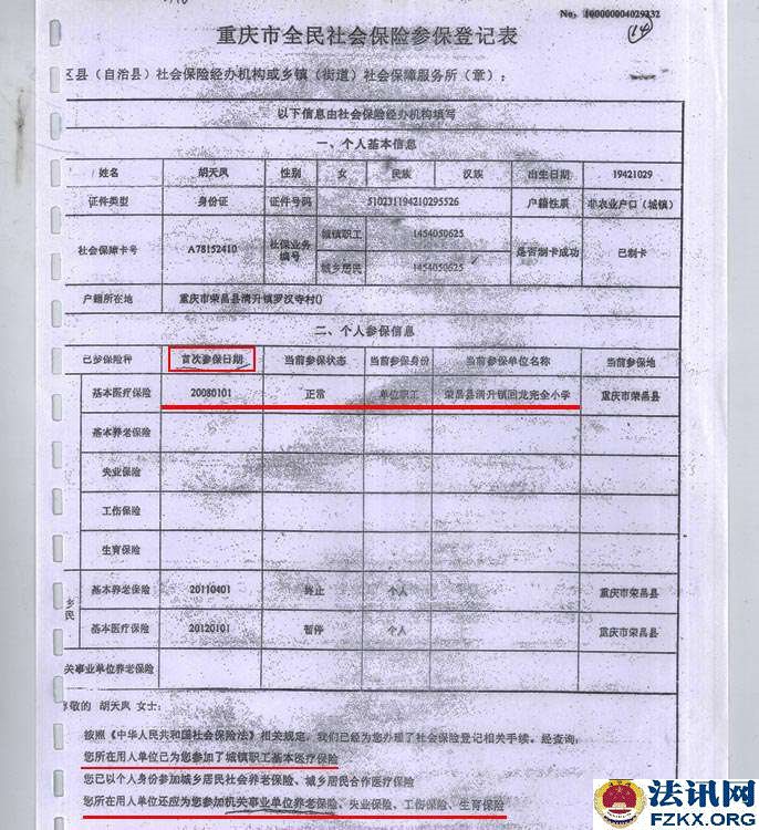 ▲图为:2008年1月1日,学校为职工胡天凤购买的医保