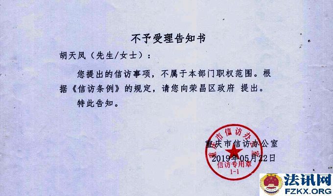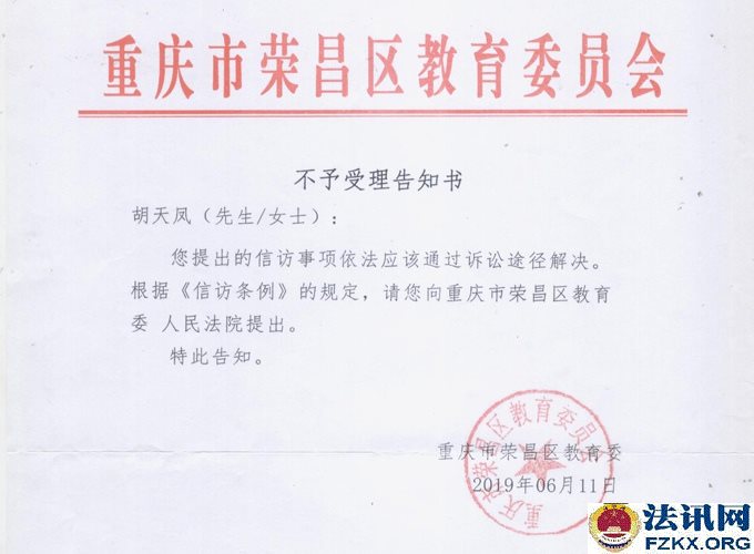 2019年5月22日,重庆市信访办公室回复,让胡天凤向荣昌区政府提出。荣昌区政府又责成区教委处理,区教委又作出不予受理的书面告知。称提出的信访事项依法应该通过诉讼途径解决,请向重庆市荣昌区教育委 人民法院提出。荒唐的是,荣昌区教委已经作出不予受理的书面告知,还让胡天凤向荣昌区教委提出!