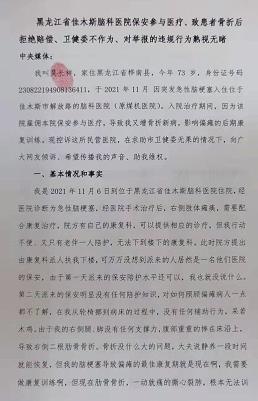 法讯网收到黑龙江省佳木斯退休老干部吴长祥的投诉信,现全文发出,希望等得到当地处理。 黑龙江省佳木斯脑科医院保安参与医疗、致患者骨折后拒绝赔偿、卫健委不作为、对举报的违规行为熟视无睹 我叫吴长祥,家住黑龙江省桦南县,今年73岁,身份证号码230822194908136411,于2021年11月因突发脑溢血入住位于佳木斯市解放路的脑科医院(原煤机医院)。入院治疗期间,因为该院雇佣本院保安参与医疗,导致我又增骨折新病,影响偏瘫的后期康复训练。现控诉这所民营医院,在求助市卫健委无果的情况下,向广大网友倾诉、希望传播我的声音、助我维权。 一、基本情况和事实 监控视频截图 我是2021年11月6日经急救120送于黑龙江省佳木斯脑科医院,经诊断为急性脑出血,经医院手术治疗后,右侧肢体瘫痪,需要配合康复治疗,院方有自己的康复科,可以提供相应的诊疗,但我行动不便、又只有老伴一人陪护,无法下到楼下的康复科。此时院方提出由康复科派人扶我下楼,可万万没想到派来的人居然是一名他们医院的保安,由于第一天派来的保安陪护水平还可以,我也就没说什么。第二天派来的保安明显没有任何陪护知识,对如何照顾偏瘫病人一点都不了解,在我从轮椅挪到病床的过程中,没有任何辅助行为,呆若木鸡。由于我的右侧腿、脚没有任何支撑力,腹部重重的摔在床沿上,导致右侧二根肋骨骨折。骨折没什么大的问题,大夫说静养一段时间就能恢复,但我的脑梗塞导致偏瘫的最佳康复期就是现在啊,我需要做康复训练啊,但现在肋骨骨折,一动就痛的撕心裂肺,根本无法训练,这很可能导致我以后右侧肢体将无任何机能。事后我们找到院方协商,院方承认自己存在过错,说是本想增加医院保安的收入,对其进行了简单的培训,在没有任何医疗执业证件的情况下,就允许其上岗了。而且在我们与院方沟通赔偿事宜时,保安仍在从事相关的医疗工作,我们将该情况反映给市卫健委,市卫健委只是很官方的要求我们走诉讼程序解决,对医院的违规行为熟视无睹、无任何处罚,如果卫健委对民营医院的监管到了如此地步、医疗行业如何发展、普通患者的权益如何保障。二、请求事项: 在与院方沟通时我们提出两项合理诉求,一是赔偿我们的合理损失,二是针对医疗侵权,院方应该公开道歉。上述要求均有合法合理的法律依据,但医院不同意,告诉我们走诉讼程序解决,但我一个70多岁的老人,又偏瘫卧床,律师费、鉴定费也拿不出,我现在是走投无路,状告无门。我想问问佳木斯脑科医院的荆利伟院长,假设你的家人在医院看病又增新病,面临以后只能靠坐轮椅生活的窘境,你该如何处理呢? 我想对这所民营医院有管理监督职能的卫健委负责人说,请你们认真调查一下这家医院,他们的管理混乱且无任何责任心,无任何资质的保安都能参与医疗,那还要有执业证的康复师干什么!这种行为难道不违反国家的法律法规吗? 我万般无奈,只有在网上发布这一事实,请网络朋友相互转告,千万不要去这家民营医院就医。我所说的有视频为证,句句事实,请大家为我伸张正义! |