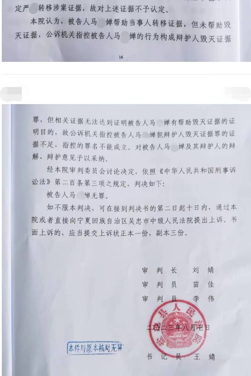 原标题:宁夏一女律师被控“辩护人毁灭证据罪”,法院一审判决无罪 宁夏律师马某婵在被警方立案侦查4年后,获得无罪判决。她曾被控涉嫌犯辩护人毁灭证据罪。 2023年8月7日,宁夏回族自治区盐池县人民法院对马某婵案作出一审判决。法院认定,公诉机关指控马某婵犯辩护人毁灭证据罪的证据不足,指控的罪名不能成立。 马某婵是宁夏一家律师事务所的执业律师。2019年,她被盐池县公安局立案侦查,涉嫌犯帮助当事人毁灭证据罪。 2021年3月,盐池县人民检察院将马某婵案公诉至法院。据检方起诉书指控,2018年7、8月份,在利通区公安局调查杨某青涉嫌高利转贷罪的期间,杨某青让王某华将其经营的恒辉小贷公司的一些发放贷款合同整理出来,交给严某礼保管。严将这些合同带回家。 2018年11月24日,严某礼因涉嫌寻衅滋事罪、强迫交易罪被刑拘后,由杨某青女儿出资给同案的人聘请辩护律师。同年11月26日,严某礼的妻子委托马某婵担任严某礼的辩护律师。 据检方指控,在马某婵担任辩护人期间,三次会见严某礼。她在了解严某礼涉嫌犯罪的情况后,问严某礼是否需要给家里人带话。严某礼让她告诉其妻子,不要将自己被拘留的事情告诉女儿,让儿子离开杨某青的公司。 严某礼还让马某婵带话给王某华(已判刑),将他家中的上述借据、合同等证据转移走。如果王某华不去转移,就让他老婆和儿子把家中的上述物品全部扔掉。 马某婵将严某礼的要求告知其妻子后,妻子将严某礼放在屋内的关于杨某青涉黑团伙的相关犯罪证据转移至老宅。此后,严某礼的妻儿将上述转移的证据交至吴忠市公安局扫黑办。经查,严某礼隐藏应当保存的会计凭证,涉案金额1.85亿元。 据判决书记载,对于检方指控的犯罪事实及罪名,马某婵均不认同。她辩称自己不构成犯罪。辩护律师同样提出,检方指控的犯罪事实不清、证据不足、指控的罪名不能成立。 顶端新闻记者注意到,法院审理查明的事实经过,与检方起诉书指控的事实经过一致。据法院判决摘引的证言,严某礼提到,通过公安机关的讯问,他觉得杨某青让其放在家里的一些放贷合同、资料都不合适了,便让马某婵带话,让王某华去他家将这些东西拉走。如果王不去拉,就让他儿子把那些东西拉到公司给王某华或者扔掉。 严某礼妻子在证言中描述,马某婵说严某礼带话,让她把将在家里的三个纸箱子和一个蛇皮袋子里的东西转移掉。 不过,法院判决书中摘引的马某婵供述中,并未提及她帮严某礼带话让其妻子转移那些放贷合同、资料等内容。 法院审理查明,辩护人毁灭证据罪的毁灭应达到使得证据毁灭丧失或部分丧失证明力。严某礼的儿子系被查的恒辉小贷公司财务人员,有独立的转移、隐匿动机。 法院认为,被告人马某婵帮助当事人转移证据,但未帮助毁灭证据,公诉机关指控马某婵的行为构成辩护人毁灭证据,但相关证据无法达到证明马某婵有帮助毁灭证据的证明目的,故公诉机关指控被告人马某婵犯辩护人毁灭证据罪的证据不足,指控的罪名不能成立。 2023年8月7日,盐池县人民法院对该案作出一审判决。法院在判决中提到,经该院审委会讨论决定,判决被告人马某婵无罪。 (原标题:宁夏一女律师被控“辩护人毁灭证据罪”,法院一审判决无罪) (来源:顶端新闻) |