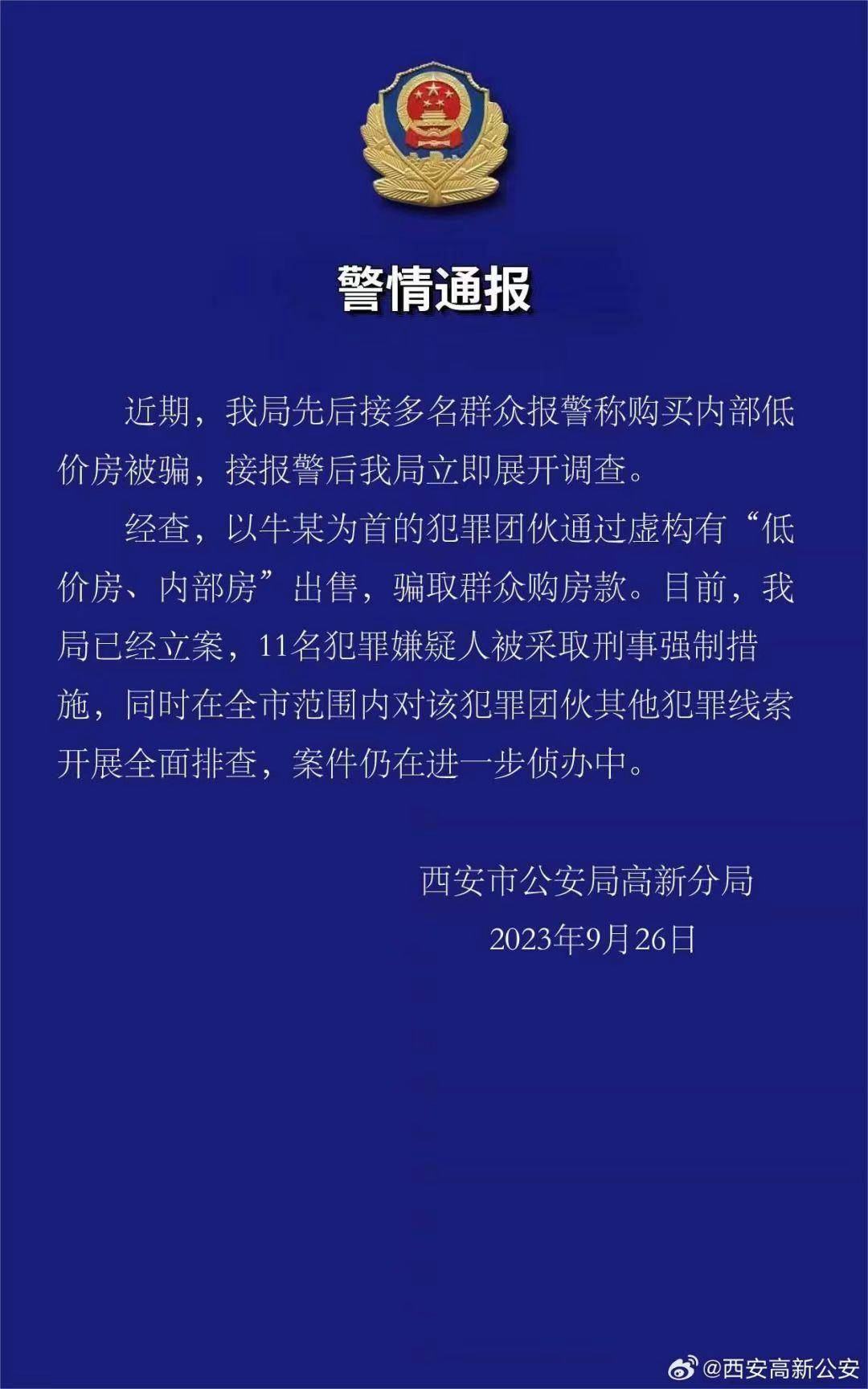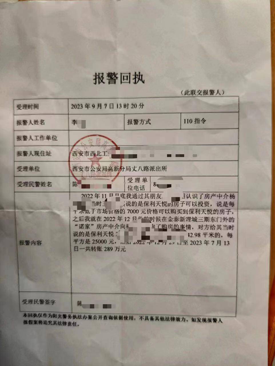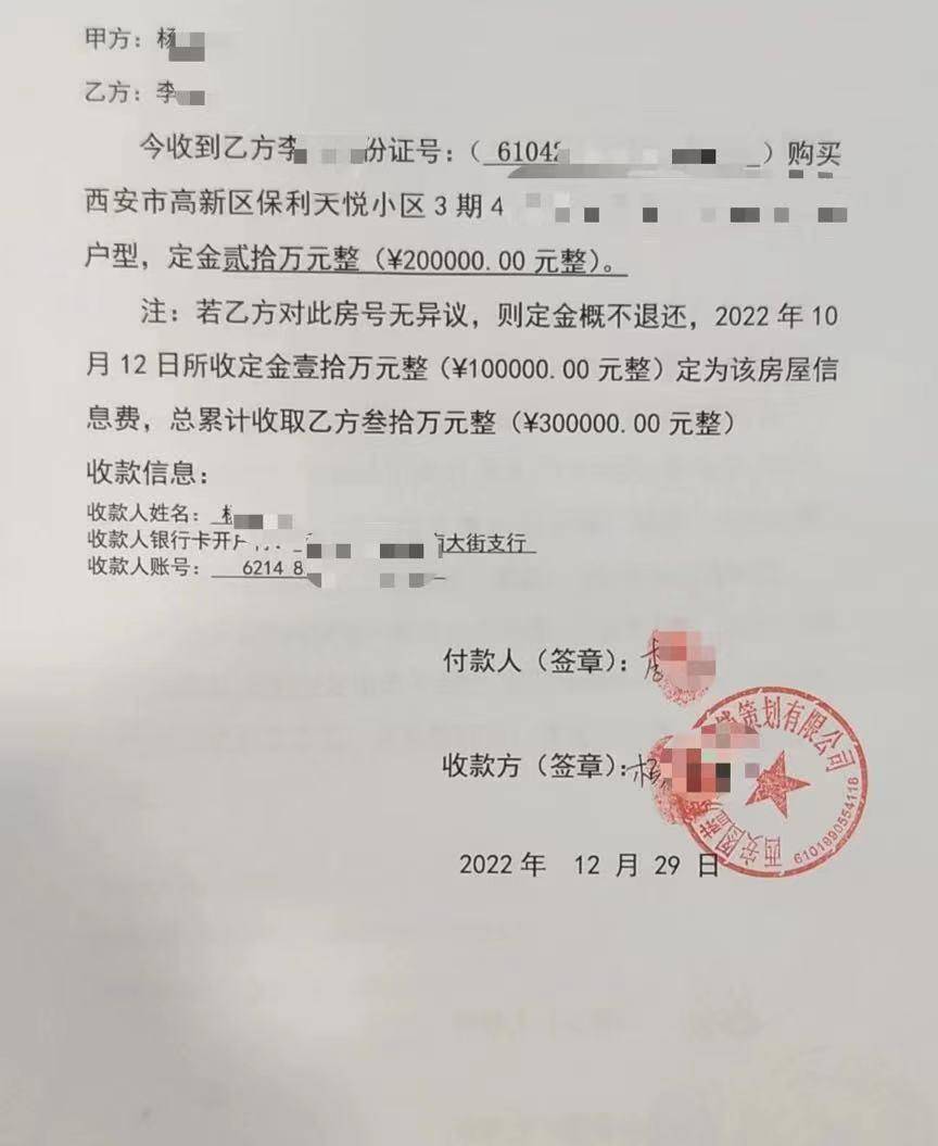 近日,多名身处陕西西安的市民向红星新闻爆料,称自己买房被骗,“中介(中间人)说有领导内部低价房售卖,他们可以帮忙操作,从交定金,给认购书,到网签都有正规协议,就是给尾款的时候以各种理由,没让我们打进监管账户,而是走了私人账户,从而导致房子一直无法过户。”这些受害者发现,他们的遭遇背后都涉及同一个人——陕西省水电开发集团股份有限公司前员工牛某。 据西安市公安局高新分局9月26日发布的警情通报显示,经查,以牛某为首的犯罪团伙通过虚构有“低价房、内部房”出售,骗取群众购房款。目前,该局已经立案,11名犯罪嫌疑人被采取刑事强制措施,同时在全市范围内对该犯罪团伙其他犯罪线索开展全面排查,案件仍在进一步侦办中。 ▲警情通报 被骗 2022年下半年,家住西安市的李先生将自己原有的房子卖掉,打算在金泰·新理城小区附近购置一套住宅,方便今后的生活。当年10月,李先生在该小区附近一家名为“诺家”的中介门店处了解到,该店有西安某企业领导的转让房,可以低价出售。 “门店中介杨某乐说,他们手上有保利签约的领导代持房,当初开盘时是1.8万元一平方米,现在可以2.5万元一平方米卖给我,只是其中要拿7000元一平方米的中间费给领导。”李先生说,当时他查过网上的市场价,大约在2.9-3万元一平方米,因此他有所怀疑。但杨某乐再三表示,自己是正规门店,还拿出一些已经过户的案例给他看。 2022年12月29日,在看房后,李先生先后将30万元定金转给了杨某乐,并拿到一份“定金协议”。在“定金协议”上,红星新闻记者看到,甲方为杨某乐,乙方为李先生。协议表明在2022年12月29日甲方收到乙方购买西安市高新区保利天悦小区3期某室的定金20万元。另外,协议还注明,若乙方对房屋无异议,则定金不退还,2022年10月12日所收的定金10万元为该房屋的信息费,总共累计收取乙方30万元。 ▲李先生提供的定金协议 “大概过了2个月,杨某乐告诉我说现在领导名下的房子已经腾出来了,可以进行网签了。”李先生说,当时一个名叫牛某的女子自称是杨某乐的领导,不仅让他签署了一份“转让权协议”,还安排他与真正的房主见过一次面,“但牛某说那个人并不是房主,只是房东代持人,他们之间有秘密协议,见了面让我不要说任何话。因此我当时什么也没说,就和对方见面,开了监管账户。” 据李先生提供的“房屋认购权转让协议”显示,甲方(出卖人)同样为杨某乐,乙方为李先生。协议表示,甲方于2023年2月21日认购位于保利天悦一期的某房屋,并与保利天悦(开发商)签订了房屋认购协议。甲方自愿将所属上述认购协议项下的全部权利义务转让给乙方,甲方协助乙方在开发商处办理房屋更名手续,并协助乙方与开发商就该房屋另行订立房屋认购协议。 ▲李先生提供的房屋认购权转让书 李先生表示,在签署“房屋认购权转让协议”后,他又转给杨某乐96万元,而这96万元是所谓给领导个人的差价。“我在网上查到自己的网签信息后,我就打算转首付款进监管账户,但这时候他们告诉我暂时不要往里面打钱。”李先生说,杨某乐、牛某一直表示钱不能转进监管账户,得让领导相信,“经过他们的再三‘纠缠’,我就将首付款的85万元转给了杨某乐,然后拿到了他们给我的提前支付付款合同。同时他也承诺我会在(2023年)5月左右完成过户。” 但李先生从2023年5月一直等到7月,始终无法过户。“中间我曾追问过对方,但牛某给我发了几张伪造的陕西投资有限公司内部的流水,让我以为钱已经被内部安排上了。”李先生说,他等到7月再也按捺不住,牛某再次联系上他,说第二天就可以过户,但需要马上给尾款,“我给了78万元的尾款后,牛某说第二天下午3点会收到短信,我也确实收到了一条监管账户已进账的信息,但后来我和真正的房主去查询的时候却发现,里面根本就没有钱。” 意识到自己可能被骗后,李先生多次联系牛某,对方却告知他房款现在暂时退不出来,“她说钱被陕投给抽回去了,因为那边的项目比较急。”另外,牛某还给李先生出具了一份“承诺函”,上面写明牛某因暂时无力退还李先生因购买保利天悦一期×××室而支付的289万元及房东诉求的违约金,所以将自己母亲梁某名下的某处房产暂时抵押给李先生。并承诺若2023年9月1日前再不能支付,此房将无条件归李先生所有。 ▲牛某出具给李先生的承诺函 报警 久等无果后,2023年9月7日,李先生选择了报警。同时,李先生也通过警方等方式得知还有多人与他情况类似,均被牛某等人骗取了大量房款。 ▲李先生提供的报警回执 “我也是通过中介说有领导内部房可以低价买,然后一通操作下来,被骗近296万元。”西安市民王先生告诉红星新闻记者,他原本在当地是有一套房产的,2022年2月因想在同小区置换一间大点的房子,通过朋友介绍认识了中介李某。 王先生说,当时他在小区里看了一套同户型的“领导低价房”后,便支付了20万元定金给李某,后来对方又出具了一份“认购书”,他又支付了30多万元。等到2022年6月份该出网签信息时,他发现自己的贷款怎么也办不下来,“我当时买这套房子的总价大概是270多万元,然后我贷款65万元,所以我往资金监管账户打了195万元,但去贷款的地方办业务时发现那套房子没有相关的产调,所以一直办不下来。” 据王先生回忆,当时牛某自称是房主的媳妇,一直以各种理由推脱,表示无