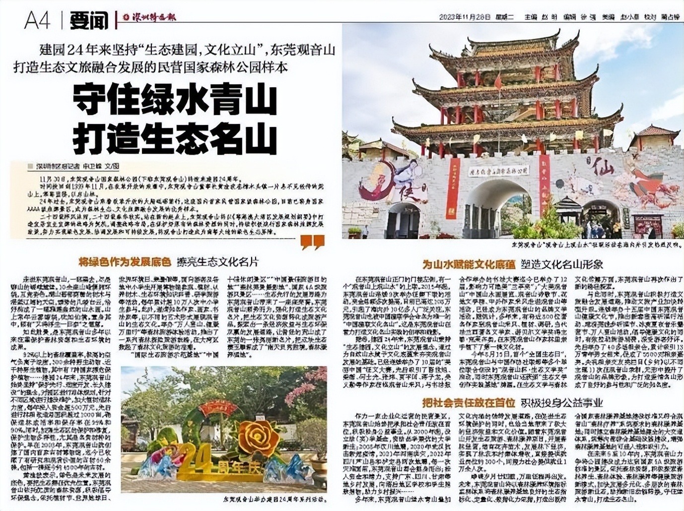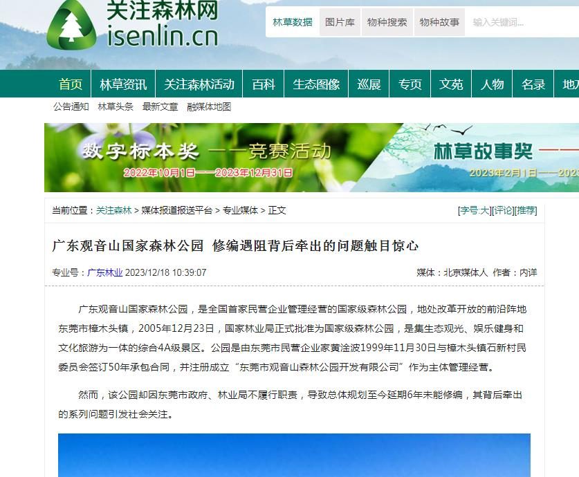 独立撰稿人 李海波 《深圳特区报》报道 《深圳特区报》报道结尾:在未来5至10年内,东莞观音山力争将公园建设成为达到国家5A级旅游标准的景区,依托森林资源,积极探索森林养生、森林体验、森林康养等健康旅游新模式,加快发展多元化、多层次的森林旅游新业态,助推新旧动能转换,守住绿水青山,打造生态名山。 上游新闻/澎湃新闻:观音山国家森林公园面临摘牌 上面这二篇文章有意思吧?!为了东莞的经济发展,民营企业在努力打造5A景区奋斗;而政府部门在设置障碍遏制其发展,更是欲将其打落凡尘而泯灭! 广东观音山国家森林公园是全国首家民营企业管理经营的国家级森林公园,由广东文化名商黄淦波于1999年与樟木头镇石新村委签订承包期50年、投资超十亿元率领300多观音山人将一座荒山打造成的是国家4A级旅游风景区,被国家林业与草原局称为“全国生态样本公园”。 自2005年12月23日批准成立观音山国家森林公园至今,观音山公司管理林地面积9857.7亩。按照《中央财政林业补助资金管理办法》规定的标准计算,观音山公司应得补贴款项500余万元。可是,该林地24年的政策性补贴款项,观音山公司及黄淦波作为实际管理人不仅未得到分文,反而还受到东莞市林业局等部门长期的各种打压。 国家级森林公园是我国自然保护地的一种重要类型,是林业现代化建设的重要内容,在生态文明和美丽中国建设中具有重要地位。加强国家级森林公园管理是各级林业主管部门的重要职责,是国家级森林公园事业健康持续发展的根本保障。国家级森林公园建设在有效保护森林风景资源、弘扬传播生态文化、满足公众美好生活需求、助力精准扶贫等方面发挥着重要作用,取得了显著成绩。与此同时,由于认识不足、监管不力、管理松散等原因,一些国家级森林公园重开发轻保护,甚至违规开发的现象依然存在。2018年1月12日, 国家林业局发布《国家林业局关于进一步加强国家级森林公园管理的通知》,一是要求各地林业局切实提高对国家级森林公园管理工作重要性的认识,各级林业主管部门要深刻汲取祁连山生态破坏事件的教训,牢固树立“绿水青山就是金山银山”和以人民为中心的发展理念,坚持保护优先、合理利用的原则,加强组织领导,强化管理监督,履行责任担当,切实把国家级森林公园管理好、保护好、建设好,以更优质的自然资源和更美好的生态环境服务社会,造福一方,惠及群众。二是全面提升国家级森林公园管理能力,准确把握国家级森林公园功能定位:国家级森林公园属国家禁止开发区域,是禁止进行工业化城镇化开发的重点生态功能区。国家级森林公园的主体功能是保护国家重要森林风景资源和生物多样性、传播森林生态文化、开展森林生态旅游;强化国家级森林公园总体规划权威性;严控建设项目使用国家级森林公园林地;严禁不符合国家级森林公园主体功能的开发活动和行为;多措并举实现国家级森林公园管理规范化。三是有效解决国家级森林公园管理中的主要问题:明晰国家级森林公园范围和界限,省级林业主管部门要统一组织,对本地区国家级森林公园的范围和界限进行逐一调查核实,确保每个国家级森林公园的范围和界限能准确落实到图纸、落实到全国林地“一张图”上;明确国家级森林公园林地保护等级,县级以上林业主管部门应当按照《全国林地保护利用规划纲要(2010—2020年)》的要求,将国家级森林公园内的林地划定为Ⅱ级及以上保护林地,切实加强国家级森林公园森林资源管理和保护;妥善处理国家级森林公园内采矿、采石等历史遗留问题。 该通知印发之日起3个月内,各省级林业主管部门要对本地区国家级森林公园开展全面排查,将无机构、无人员、无规划、无建设的“四无”森林公园以及存在重大违法违规建设的森林公园名单报送我局。我局将下发限期整改通知,对整改达不到要求的将按程序撤销该国家级森林公园,并对违法违规事件依法进行处理。局驻各地森林资源监督专员办事处对本监督区国家级森林公园建设管理中存在的突出问题及整改落实情况实施监督。 光明日报的报道 林业局是森林公园的保护神,从中央媒体到地方媒体却不断曝出观音山公园被东莞市林业局多方打压的现象 但观音山公园遇到的违法违规事件却并没有得到处理,因为东莞市林业局没有上报观音山公园内相关违建及被毁林等违法行为。 东莞市林业局连续四任局长无视观音山国家森林公园被摧残 其实,对于观音山国家森林公园内的违规建设及毁林行为,观音山公园除了向东莞市委市政府和各级林业部门举报外,包括中央电视台、新快报等中央及地方媒体均有不断曝光,而作为主管部门的东莞市林业局从罗松茂担任局长开始连续二十年四任局长均不予理睬,以软暴力对应。何谓软暴力?就是对观音山合法诉求不支持、不配合、不作为,反而使用手中的权力摧残观音山公园。 央视财经的报道 2012年中央电视台以《国家4A级森林公园竟藏22栋私人别墅》为题报道 众多文章反映了东莞市林业局放任不法分子在森林公园大量建豪华坟墓、香港人在公园内修建别墅、不法分子毁林种植荔枝林等毁林2000亩案件视而不见,东莞市林业局长期坚决否认观音山有毁林现象。同时还曝光了林业局在原市委书记刘志庚(落马贪官,被判刑)和是市政法委书记张志雄授意下