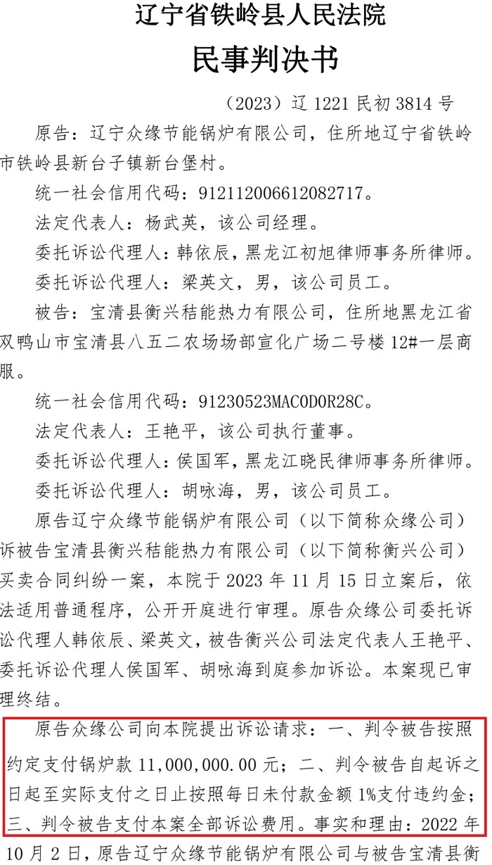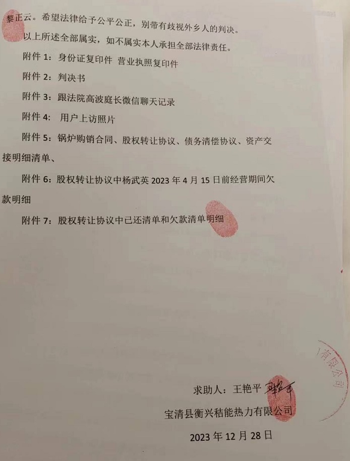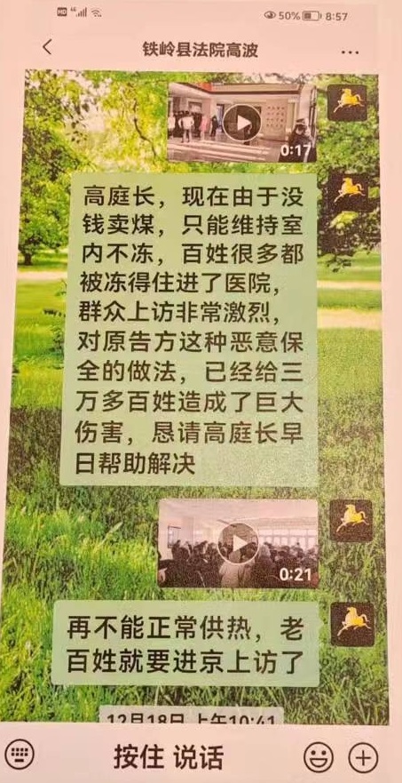 | 黑龙江民生企业投诉被辽宁法院违规查封引发群体事件 日前,法讯网收到了黑龙江宝清县衡兴秸能热力有限公司法人王艳平发来的求助信,反映公司在毫不知情的情况下被辽宁铁岭县人民法院将公司的三家银行账户各自查封1900多万后,无法购买供热燃料及无法正常经营而引起大批居民到政府部门上访并上传至抖音、快手等平台,造成极坏影响…… 法讯网全文发出求助信,小伙伴们有什么看法? 求助信 中央媒体: 我是黑龙江省宝清县衡兴秸能热力有限公司法人王艳平,身份证号码:230521197403032****,电话号码:18904691*** 我公司是为黑龙江宝清县3万多户居民供热的民生企业,于2023年11月13日被辽宁众缘节能锅炉有限公司在双方债务并未确定实际数额的情况下,以欠款为由恶意起诉至辽宁省铁岭县法院,并查封我公司三个银行账户各自1900多万元。该院在未对案件实体审查的前提下受理此案,并查封我公司账户近6千万元。 ![]() 对方起诉请求1100万元,法院却查封了建设银行的1920万元,还查封了邮政银行、农行账户各自1900多万元! 该院未下达裁定书,在11月27日我公司在购买原煤时发现账户被冻结并向银行询问原因时,银行回复是辽宁省铁岭县人民法院查封后,我们通过拨打12368查询案件主审法官黎正云法官办公室电话询问查封原因,询问后才通过短信方式给我公司下达起诉状,我公司法人王艳平询问为什么对我公司银行账户查封十天后也未通过任何形式告知我公司及我本人,经过公司法人询问,法庭黎法官回答我庭工作人员少,未能及时通知望理解,我本人认为法庭在受理此案过程中不作为、慢作为,程序有失公正。我公司向具体审理此案的该院腰堡法庭申请提供解除担保申请书,并提供了本企业价值五千余万元的资产评估报告书做担保,黎正云法官当时同意要求我方提出书面替换保全申请,高波庭长不同意替换保全申请,未被允许,后又向法庭申请由具有资质且在全国及辽宁省都有成功担保案例的担保公司对我公司账户进行反担保时,高波又以原告方不同意为由拒绝。原告保险公司可以担保,我公司提出用有资质的并有成功反担保案例的担保公司进行担保,多次跟高庭长沟通企业无法经营,热用户上访事件,高波庭长未理会。请问法庭是听原告还是听被告,这种说词能公平公正吗?根据最高人民法院出台的【民事诉讼法】第一百零七条规定:“财产纠纷案件,被申请人提供担保的,人民法院应当裁定解除保全”。该法条的法律释义:规定在征求原告方意见时,只需要履行告知程序,而非必须原告方同意。 而该庭正是以原告方不同意为由拒绝,导致我公司现无任何资金。 ![]() 极寒天气因查封无法保证温度,导致大量居民上访视频截图 购买供热燃料及无法正常经营,供热锅炉也无法正常运行,面临停热局面,近期黑龙江省极寒天气夜间气温达到零下-30~-34℃,因无燃料,当地居民室温只有零上5~10℃,居民生活苦不堪言。大批居民到政府部门上访并上传至抖音、快手等平台,给当地政府及我公司造成极坏影响,已被省住建厅通过视频会议通报,被双鸭山市住建局约谈,现恳请有关部门尽快落实12月15日习近平主席提出的保供暖、保民生的讲话。 高波庭长于辽宁众缘节能锅炉有限公司法人杨武英关系密切,影响司法公正。杨武英多次示意我本人在当地官司永远打不赢。 ![]() 经过本人多次向法庭催要判决结果才于2023年12月28日收到了2023年12月26日生效的电子版判决书。2023年12月26日铁岭法院执行庭两位工作人员到宝清县中国人民建设银行宝清支行降低查封额,由原查封1920万元降低为1100万元,部分解除了820万元。 希望中央媒体给予关注,曝光不作为、慢作为的庭长高波,法官黎正云。希望法律给予公平公正,别带有歧视外乡人的判决。 以上所述全部属实,如不属实本人承担全部法律责任。 求助人:王艳平 宝清县衡兴秸能热力有限公司 2023年12月28日 ![]() 据衡兴秸能热力有限公司查了一下,这个众缘节能锅炉有限公司在辽宁有50多起案件,基本上都是在这个法庭,且都是胜诉。而本案众源公司起诉标的额为1100万元,但法院却查封了衡兴秸能热力公司的几个银行账户达几千万元,导致公司无法运营而造成恶劣的影响,如此损失谁来承担责任?! 而对于本案的一审判决,衡兴秸能热力公司表示会上诉以维护自己的合法权益。 本网将继续关注此事的后续情况。 在只解封了800万元后,公司法人再次联系黎正云法官,在12月29日的通话录音,听听吧?! |