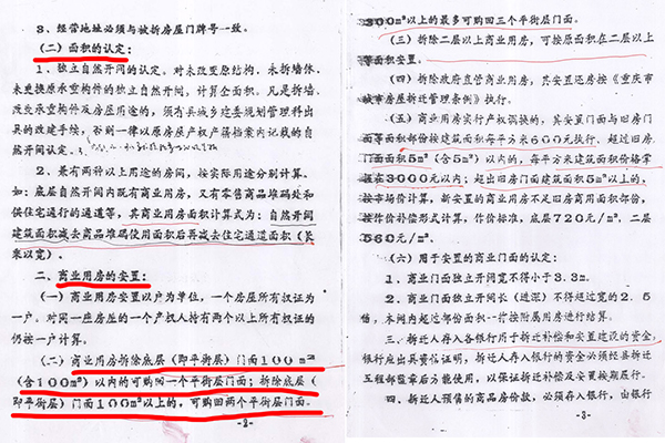 | 重庆荣昌区原房管局:06年多收被安置户房款7.8万牵出“案中案” 独立撰稿人/邓爱华 1997年旧城改造,房管局长隐瞒政策,安置面积缩水,门面充住房安置,领款凭证变成交款收据,2006年多收被安置户房款7.8万元。 被安置户通过信息公开,及在房管局内部人员帮助下,调取到当年拆迁安置补偿情况和政策文件。住建委要求被拆迁户走司法途径,一审二审再审建委却以“超过起诉期限、补偿安置方案已履行”为由不到庭,法院不开庭,以书面形式审理后驳回诉求,检察院也不支持监督申请。拆迁科长一句话,去中天公司查领款凭证,却牵出另一个案子。拆迁工程部变成中天公司,由房管局办公室主任1999年注册,正副局长、会计(职工家属)参与,40个股东(5人每人出资2.2万元,35人每人出资2万元),负责代办房屋拆迁、安置,房地产信息咨询、交易代理,丈量面积,代办房地产报批,房屋招租。 40个股东拥有50个门面,坐分租金,后因政策变动对门面进行分批处置。 2021年2月份卖了6个。3月份公开竞卖21个,底价高达2159万元,其818.59㎡面积哪来的?目前,50个门面全部卖完。 01 房管局副局长说,今年的拆迁政策是,各了各的算,口头传达的,没有拆迁文件? 1997年,荣昌县昌元初级中学扩建校园,需拆迁昌元镇大东街106-128号、132号-140号、144号(双号)及附号、祥和路18至32号(双号)及附号等约六千平方米建(构)筑物。 3月8日,在县老干局会议室召开拆迁安置动员大会,房管局副局长张远淑(下称张局长)主持会议,说今年的拆迁政策是,各了个各的算。房管局按评估价把你的房子买过来,修好后你又按评估价买回去。 梁太英说:“我和我老公多次要求看拆迁文件,张局长说是口头传达的,没有拆迁文件。” “我是在2020年5月12日通过政府信息公开方式,才获取由重庆市住房和城乡建设委员会提供的1997年重庆市城市房屋拆迁适用的是《重庆市城市房屋拆迁管理条例》(重人发〔1992〕19号),又在2022年1月5日获取由重庆市荣昌区房屋征地拆迁中心(下称征地拆迁中心)获取的《荣昌府发〔1995〕60号关于旧城改造中商业用房的认定及安置的通知》早在1995年3月24日出台。” ![]() (重人发〔1992〕19号)。梁太英 供图 ![]() 荣昌府发〔1995〕60号。梁太英 供图 “虽然在2022年调取的房屋拆迁公告显示有拆迁条例,其真实性存在问题。日期也是‘197年’3月7日,为三国时期。” ![]() 2022年调取的房屋拆迁公告。梁太英 供图 “在2007年调取的《拆迁安置补偿协议书》里,仍然没有公开当年拆迁安置补偿政策文件依据。” 02 住宅面积109.51㎡改为259.83㎡,非住宅由397.67㎡改为248㎡(商业用房223.52㎡、其它7.34㎡、营业用房只有16.23㎡) 房管局下属部门荣昌县城镇建设拆迁工程部(下称拆迁工程部)在拆迁动员大会之前的1996年4月18日已对昌元镇大东街108号李北超、梁太英私有财产进行了现场登记查勘(下称现场查勘表)。 ![]() 现场登记查勘表。梁太英 供图 梁太英说:“房屋一共三层,从2021年12月14日调取的《现场查勘表》数据计算,第一层201.685㎡,第二层195.85㎡,第三层109.51㎡,合计507.18㎡。查勘表注明,第一层、第二层为营业用房,共397.67㎡,第三层为住宅只有109.51㎡。” 查勘人黄天艳、王秀荣计算,三层合计才498.24㎡,比梁太英计算的507.18㎡少8.94㎡。最终认定有效面积为507.83㎡。 从2021年3月10日调取的1996年3月20日《旧城改造拆迁安置情况统计表》(下称拆迁安置统计表)来看,住宅面积由《现场查勘表》109.51㎡改为259.83㎡,非住宅面积由397.67㎡改为248㎡(商用房223.52㎡、其它7.34㎡、营业用房只有16.23㎡)。 ![]() 旧城改造拆迁安置情况统计表。梁太英 供图 梁太英说:“一楼进门门面是摄影器材→歌舞厅→包间→舞厅厨房,53.27㎡住宅面积从何而来?二楼前面是休息室→摄影场→餐厅→天井→餐厅备料间→餐厅厨房,哪来的259.83㎡住宅面积?三楼才是住宅,四个寝室,一共只有109.51㎡。” 03 第一份协议消失,第二份协议显示被安置户“签名”却申明作废,第三份协议有效又没有被安置户签名? 梁太英说,她家拆迁面积最多,安置面积最少,1997年拆迁,1998年搬进安置房后,因安置补偿不合理,一直没有去办理房屋产权证。是2006年3月房管局的人说,‘再不去交安置房款和办理房产证,就视为自愿放弃拆迁安置权利’。这一条款也写入了《拆迁安置补偿协议书》。 “3月14日,我才到房管局把《拆迁安置情况统计表》、《拆迁安置补偿协议书》(没有签名)拿回来,第二天才到大厅产权证登记窗口交钱,交钱后工作人员将统计表和协议收回,一个星期后,带上交款收据去领取产权证的。” 梁太英说:“交钱时那份协议,是第一份协议,下方注明有补门面款38000元、住房款50928.86元,这份协议之后消失了,只有一份收据,总金额为88928.86元,” ![]() 门面、住房交款收据。梁太英 供图 “那份协议,我也看见,补门面款38000块钱,住房补多少钱记不起了。”梁太英的女儿说。 “2007年,我到拆迁中心把《拆迁安置补偿协议书》调出来看,不是第一份办产权证那份协议,下面没有注明门面、住房补多少钱了,也没有显示我和我老公(已故)‘签名’。该协议为第二份,显示日期1997年3月24日。” ![]() 第二份协议,没有被安置户签字、盖印。梁太英 供图 之后,每次调出来的都是1997年3月24日那份协议。 梁太英说:“2021年3月10日,拆迁中心田静科长说找到我们当年签名的安置补偿协议了,