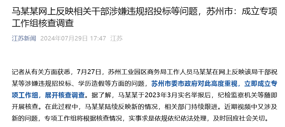 据新黄河消息,7月28日,自称2018届清华大学毕业生、苏州工业园区商务局科员马翔宇在网上公开实名举报其供职的苏州工业园区商务局局长祝某及其团伙违反政治纪律、组织纪律、工作纪律、廉洁纪律,在政府采购中围标串标、虚设项目套取资金、进行利益输送、向省委巡视组提供虚假材料,以及祝某本人学历造假。 28日下午,记者联系到祝某本人,其表示,“这件事我现在不方便表态,你可以联系我们苏州工业园区宣传部。”记者随后多次拨打宣传部电话,但无人接听。苏州工业园区新闻中心的工作人员则表示,“我们有关注到这个情况,相关的部门也正在核实中,具体的结果要等核实结果出来后,我们会第一时间反馈。” 7月29日下午,据江苏新闻消息,记者从有关方面获悉,7月27日,苏州工业园区商务局工作人员马某某在网上反映该局干部祝某等涉嫌违规招投标、学历造假等方面的问题,苏州市委市政府对此高度重视,立即成立专项工作组,展开核查调查。据了解,马某某于2023年3月实名举报后,纪检监察机关等随即开展核查。在此过程中,马某某陆续反映新的情况,相关部门持续跟进。近期视频中又涉及新的问题,专项工作组将根据核查情况,实事求是依规依纪依法处理,及时回应社会关切。 【来源:九派新闻综合新黄河、江苏新闻】 |