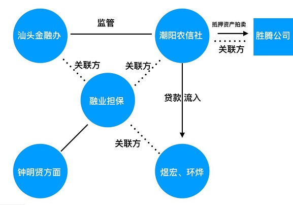 自此,钟明贤贷款事件的链条或已清晰——融业担保作为中间环节,向上连接了汕头市金融办和潮阳农信社,向下连接了贷款方钟明贤和接收贷款的两家公司。钟明贤抵押的资产被拍卖后,买下资产的胜腾公司则与潮阳农信社有关联。