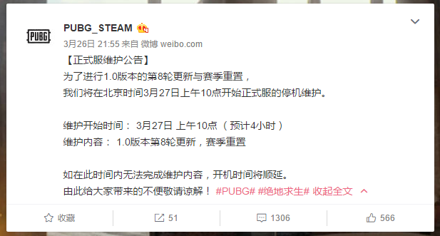 3月26日晚,蓝洞在宣布测试服更新的同时发布新一条官微,宣布正式服在第二天上午十点停机维护之后更新。