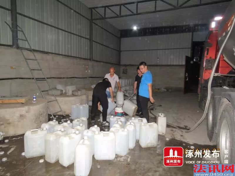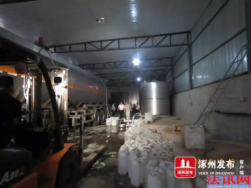 涿州市食品药品监督管理局在河北省食品药品监督管理局稽查局的直接指挥下,现场,执法人员发现该窝点内存放着大量无标识散装白酒及多种知名白酒的包装瓶、瓶盖、标签、包装盒。 加工设备仅有不锈钢罐和泵,原料为食用酒精和水,加工成本低,制作手法简单,主要是用一定比例的食用酒精和水勾兑成食用白酒,以每桶(25㎏/桶)50元不等的价格销往农村市场,谋取不法利益。
