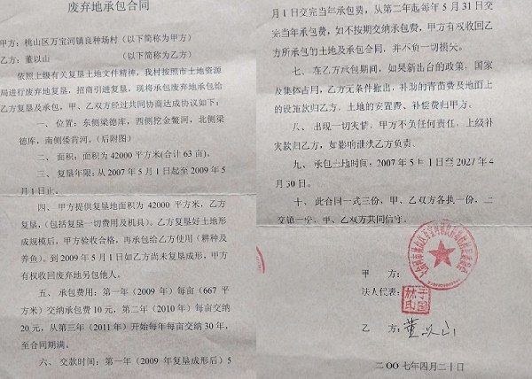 求助信 2018年3月,七台河动迁办让村里通知我到我家承包土地动迁,量了一天后就撤离了,隔几天,村里又通知我研究动迁,这次主持动迁单位不是市动迁办,是桃山区棚改办,棚改办对我承包土地及附着物登记造册后,让我在清单上签字,同年5月12日,桃山区防汛指挥部突然对我下达限期清除障碍通知书,让我自行清除我承包三十多年土地上鸡舍、猪舍、看护房、山庄、养鱼池、蔬菜大棚等地面的附着物,我当时与防汛指挥部的人发生争执,也未同意自行清除,并拒绝签字。5月18日,区棚改办带着推土机,铲车强行将我鸡舍、猪舍、看护房等拆除面积779.5平方米。同时被强行拆除的还有几十家村民的地面附着物。6月,我们被强拆村民开始上访,区政府强拆违法行为停止。10月3日,棚改办召集我们研究下一步拆迁评估。让我们选择第三方评估机构,在三家评估公司我们当时选择了哈尔滨市一家评估公司。可是,由于哈尔滨评估公司依据市场价格对我们尚未动迁的地面附着物进行评估,与政府欲给我们所谓成本价相差太多。只用他们评估一天就撵走了。然后用本市一家评估公司进行评估,评估出的价格比市场价低出两倍。有的连成本价都没达到。如养鱼池每米作价35~50元。成本价最少150元,连推一平方米机动车油的费用都不够。更为严重的是棚改办对我们的看护房,鸡舍、猪舍、平房、农家乐、山庄、树木等不给评估,认定这些建筑是违章建筑,不给补偿。同时,对于定价拆迁的标的物让我们转让给七台河市城投公司,不让我们和市政府直接签订补偿协议,其手段十分卑劣,真是坑农害农,损害农民利益的违法杰作。希望在全国各大媒体给予曝光。 村委收到董以山的房号款出具的收据 废弃地承包合同 农业部制发的水域滩涂养殖使用证 2019年1月18日 七台河市土地管理局颁发的用地申请书 鱼塘承包协议书 |