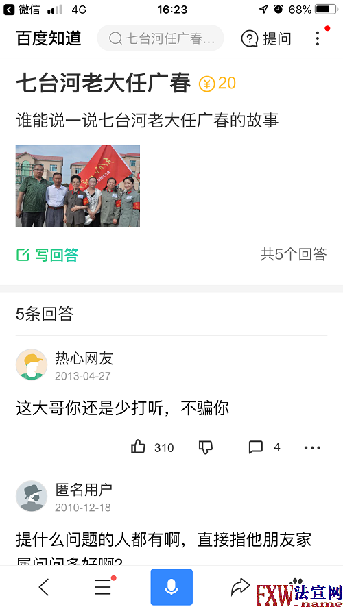 9月28日早上,法讯网发布《黑龙江省七台河市涉黑大哥任广春及其保护伞何时处理?》后,早上微信收到自称任广春加好友,法讯君以为是一通讯员,便同意了。对方第一句话便是:把帖子删掉,然后质问你们调查了吗?见此,法讯君告知删帖需要公安局或者法院的函件证明不属实才能删除。之后法讯君删除了该微信。 该文作者纪奎权也电话告知法讯君,原某网站黑龙江频道的负责人微信他先是说法讯网是非法网站,后来就要给2万元删除该帖子。纪奎权告知不收费删帖,公安局或法院来函才行。 该QQ要加好友,法讯君告知处理方式。 之后,多个七台河的QQ要加好友,法讯君均予以拒绝。