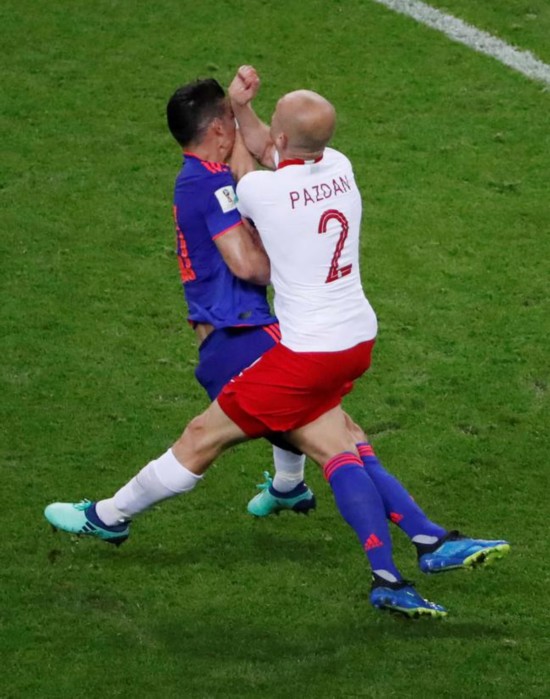 伊基塔与巴尔德拉马庆祝 法尔考被巴卡换下,他给J罗戴上队长袖标。波兰未能将对方长传破坏出禁区,乌里韦右侧距门5米处小角度脚后跟射门,斯琴斯尼混乱中脱手,好在贝德纳雷克回身门线解围。J罗主罚任意球偏出左门柱。特奥多尔奇克左肋断球回做,莱万在门前24米处大力抽射被奥斯皮纳托出横梁。哥伦比亚最终3比0完胜。 波兰(3-4-3):1-斯琴斯尼/20-皮什切克,5-贝德纳雷克,2-帕玆丹/18-贝雷申斯基(72\'14-特奥多尔奇克),10-克雷霍维亚克,6-古拉尔斯基,13-雷布斯/19-杰林斯基,9-莱万多夫斯基,23-科夫纳茨基(57\'11-格罗西茨基) 哥伦比亚(4-2-3-1):1-奥斯皮纳/4-阿里亚斯,13-米纳,23-达温松-桑切斯,17-莫西卡/8-阿吉拉尔(32\'15-乌里韦),5-维尔马尔-巴里奥斯/11-夸德拉多,20-金特罗(73\'16-莱尔马),10-哈梅斯-罗德里格斯/9-法尔考(78\'7-巴卡) (马舸) |
