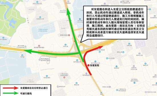 随着复工复产的有序推进,南宁市部分路段市政项目陆续恢复施工。3月5日上午10点起,西乡塘区友爱立交桥将进行围挡施工,对市民出行带来一定影响。交警部门提醒广大驾驶人,请关注施工路段信息,提前规划出行路线,做到安全文明通行。 友爱立交桥南北向主桥面伸缩缝改造工程 ![]() 3月5日10点至3月19日24点,对北往南向主桥面封闭施工,届时安吉大道往友爱路、秀厢大道东段的车辆通过友爱立交桥底道路通行,往秀厢大道西段的车辆可通过现有匝道通行。 ![]() 3月20日0点至4月3日24点,对南往北向的主桥面进行封闭施工,届时友爱路往安吉大道的车辆通过借道对向主桥面(北往南)通行,安吉大道北往南方向的车辆按照第一阶段通行方式实施。 友爱医院拆除工程 ![]() 3月5日10点至4月15日,对友爱路右转进入友爱立交桥底的便道进行封闭,禁止机动车通过便道进入桥底,非机动车和行人可通过预留便道通行。施工方将根据施工需要对非机动车和行人便道实行短时间封闭,请非机动车和行人服从现场管理人员指挥引导。 施工期间,由友爱路(南往北方向 )右转往秀厢大道东段的车辆可通过现有匝道往秀灵立交桥底掉头,或者直行前往安吉大道后选择周边道路绕行。 友爱立交桥东北角便道 (交警一大队门口至城管综合执法支队门口段) 本月起,对友爱立交桥东北角便道封闭后进行污水管网施工,工期约3个月。施工期间禁止机动车通行,非机动车可通过预留便道通行。需通行施工路段的机动车,可根据沿线交通指引标志牌,通过秀安路、秀灵立交桥、友爱立交桥底道路、安吉大道等道路通行。 来源:南宁交警微发布 |