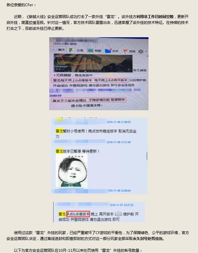 玩辅助界的朋友应该都知道雷龙已经跑路两周了,可是TX这狗血剧情为什么又出来给雷龙宣传了一波? 这周有确切消息周五晚上雷龙要回归,而腾讯今天发公告,应该明确就是警告作者敢回归开版本我秒和谐。 下面整理一波***B腾讯历史 发布到公告成功打击的外挂 如下: 8月10号腾讯发布消息成功打击SY(Avast)透视:http://t.cn/Rt0Atu2 8月26号腾讯发布消息成功打击台湾驱动(大陆):http://t.cn/RtDhhom 9月8号腾讯发布消息成功打击昆零(冰易网游):http://t.cn/RcqNpkJ 10月20号腾讯发布消息成功打击反恐(蝙蝠侠):http://t.cn/RVprp7y 12月2号腾讯发布消息成功打击雷龙内存自瞄:http://t.cn/RfuIQuK |