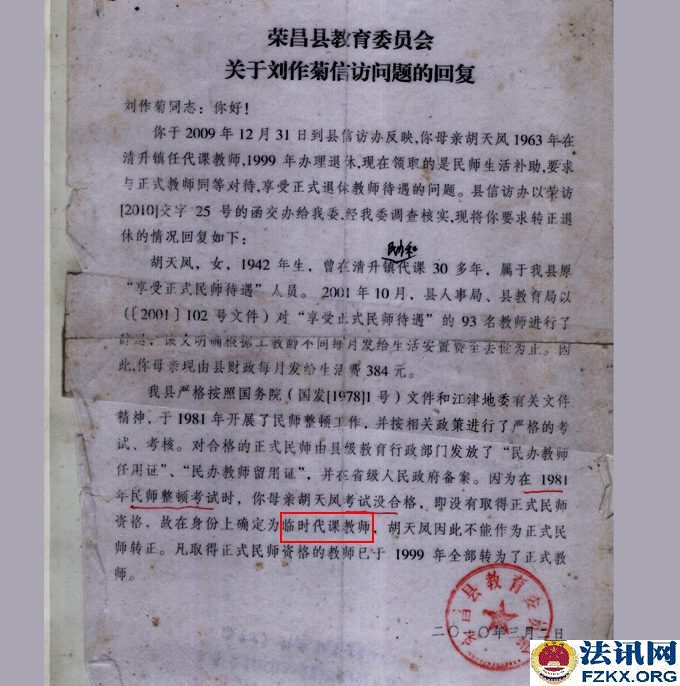 ▲图为:荣昌县教委信访回复胡天凤是“临时代课教师”