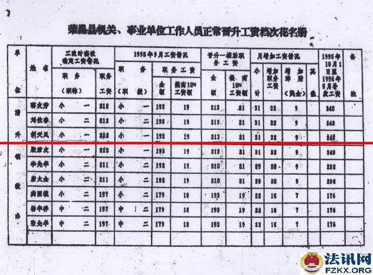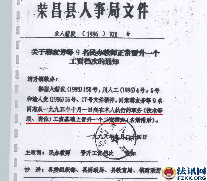 ▲图为:荣人薪发【1996】720号文件,胡天凤已享受在册中小学教师提高10%的工资