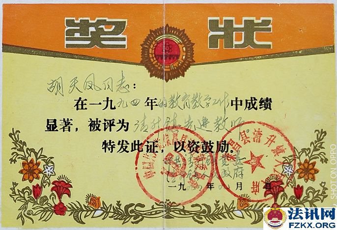 荣昌县教育局《荣教人发【1993】5号》文件关于胡天凤同志可享受正式民师待遇的通知,工教龄从1963年3月算起。1994年9月胡天凤被清升镇党委、清升镇政府评为先进教师;1994年12月4日,清升镇甘桥完全小学聘胡天凤为一级教师;1994年12月,重庆市人民政府授予胡天凤为小学一级教师,并颁发专业技术资格证书;1995年12月8日,荣昌县教育局为胡天凤颁发了小学一级教师证。