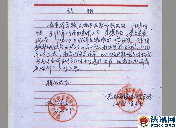 ▲图为:2006年8月5日甘桥完全小学、镇教管中心证明