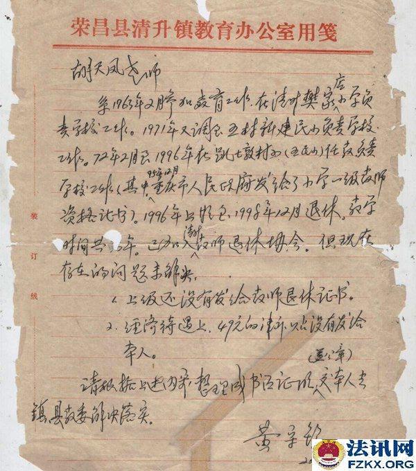 胡天凤持有清升镇甘桥完全小学发放的小学一级教师聘书、重庆市人民政府发放的小学一级教师专业技术资格证书、荣昌县教育局发放的小学一级教师证,历年来工资表上显示的是“退休教师”,2008年清升镇回龙完全小学也为“单位职工胡天凤”购买了“城镇职工医疗保险”(卡号:A78152410)。然而,在2010年荣昌县教育局信访回复,胡天凤的身份又是“临时代课教师”,荣昌县教育局并未将荣昌县教育局、荣昌县人事局作出的《荣教人发【2001】102号》(关于辞退和妥善安置“享受正式民师待遇”教师的通知)送达胡天凤知晓,是2014年庭审中才知道增加了50元钱后作为被“辞退”的依据。事实上,该文件明确的是:“凡教龄男满30年,女满25年的,享受正式民师待遇的教师,1998年以来未调整工资的,在现行月工资标准的基础上,可增加50元后,再按两项之和的100%计发月安置费”,《荣人薪发【1996】720号》文件已对身份进行了确认,就不应对胡天凤增加50元。其增加了50元,就是以发放安置费代替退休。