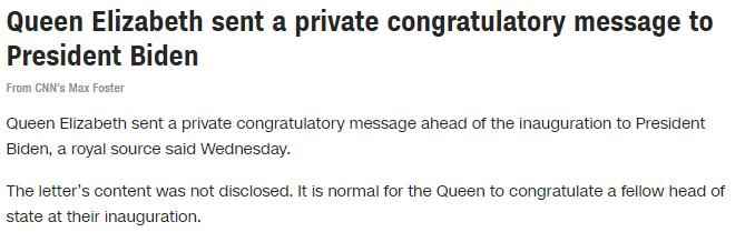原标题:拜登就任美国总统,英国女王发贺电 [环球网报道]美国有线电视新闻网(CNN)刚刚消息,当地时间1月20日,一位英国王室消息人士透露,拜登就职典礼前,英国女王伊丽莎白二世发来私人贺电。 报道称,贺电的内容没有被披露。不过在CNN看来,女王在其他国家元首的就职典礼上祝贺他们是很正常的。 据此前报道,拜登20日在美国首都华盛顿国会山举行的就职典礼上宣誓就任美国第46任总统。随后,印度总理莫迪、英国首相约翰逊、日本首相菅义伟、加拿大总理特鲁多等发推祝贺。 点击进入专题: 新闻热点精选 |