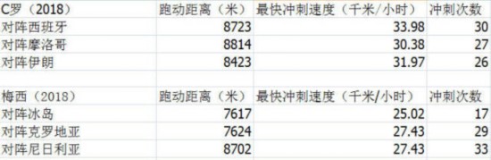 C罗3场的最快冲刺速度都有超过30千米/小时的纪录,而梅西却没有一次——C罗本身无球跑动爆发力就非常出色,而梅西往往要拿到皮球才更显快人一步。