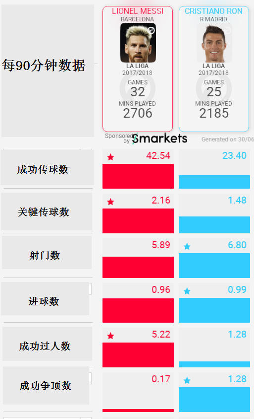 梅西和C罗上赛季联赛每90分钟的数据对比。