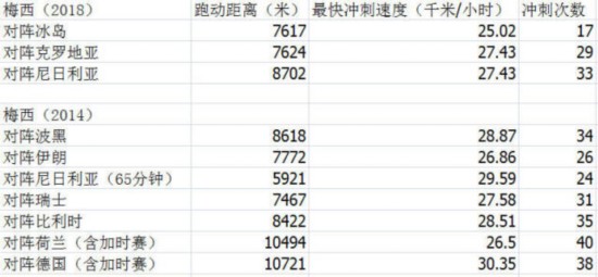 而在本届世界杯上,梅西的场均跑动距离为7981米,与上届平均相差100米不到。