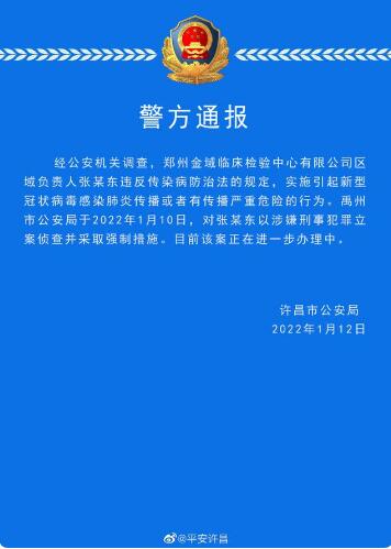 1月12日,河南许昌警方通报称,经公安机关调查,郑州金域临床检验中心有限公司区域负责人张某东违反传染病防治法规定,实施引起新型冠状病毒感染肺炎传播或者有传播严重危险的行为。